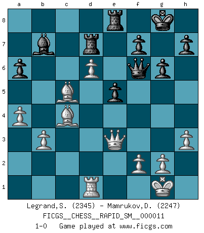Last move : 1-0 2014 March 3 3:4:26 [Event "FICGS__CHESS__RAPID_SM__000011"] [Site "FICGS"] [Date "2013.12.26"] [Round "1"] [White "Legrand,Stephane"] [Black "Mamrukov,Dmitri"] [Result "1-0"] [WhiteElo "2345"] [BlackElo "2247"] 1.e4 e5 2.Nf3 Nc6 3.Bb5 a6 4.Ba4 Nf6 5.O-O Be7 6.Re1 b5 7.Bb3 d6 8.c3 O-O 9.h3 Nb8 10.d4 Nbd7 11.Nbd2 Bb7 12.Bc2 Re8 13.a4 Bf8 14.Bd3 c6 15.b3 g6 16.Qc2 Rc8 17.Ba3 Nh5 18.Bf1 exd4 19.cxd4 Nf4 20.Qa2 Ne6 21.e5 b4 22.Bxb4 c5 23.dxc5 Nxe5 24.Nxe5 dxe5 25.Nc4 Nf4 26.Qd2 Qf6 27.Re3 Nd5 28.Nd6 Bxd6 29.cxd6 Nxe3 30.Qxe3 Red8 31.Rd1 Rd7 32.Bc4 Re8 33.Bc5 1-0 Ruy Lopez : Closed Kingside Castling by player White (move 5) Kingside Castling by player Black (move 8) Player White won this chess game. Follow this game move after move (download)A Chess game is a dialogue, a conversation between a player and his opponent. Each move by the opponent may contain threats or be a blunder, but a player cannot defend against threats or take advantage of blunders if he does not first ask himself: What is my opponent planning after each move ? (Bruce A. Moon) Er war ein guter Schachspieler, aber ich kann Leute nicht ausstehen, die 'Heil Hitler' rufen (Über Alexander Aljechin). (Miguel Najdorf) No hay un Gran Maestro de Ajedrez que sea normal; solo se diferencían ellos por la magnitud de su locura. (Viktor Korchnoi) Votre prénom est 'Tactique', votre deuxième prénom est 'Tactique' et votre nom est 'Tactique'. (Ken Smith) Everybody lies. (Gregory House, House M.D.)
