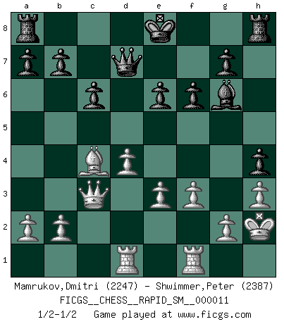 Last move : 1/2-1/2 2014 January 16 6:31:42 [Event "FICGS__CHESS__RAPID_SM__000011"] [Site "FICGS"] [Date "2013.12.26"] [Round "1"] [White "Mamrukov,Dmitri"] [Black "Shwimmer,Peter"] [Result "1/2-1/2"] [WhiteElo "2247"] [BlackElo "2387"] 1.d4 d5 2.c4 c6 3.Nf3 Nf6 4.Qc2 dxc4 5.Qxc4 Bg4 6.Nc3 Nbd7 7.Bf4 Nb6 8.Qd3 Nbd5 9.Nxd5 Qxd5 10.Nd2 Bf5 11.Qc3 Qd7 12.Be5 h5 13.h3 e6 14.Rd1 h4 15.e3 Ne4 16.Nxe4 Bxe4 17.f3 Bg6 18.Bc4 f6 19.Bh2 Bd6 20.O-O Bxh2+ 21.Kxh2 1/2-1/2 QGD Slav : 3.Nf3 Kingside Castling by player White (move 20) This chess game ended in a draw. Follow this game move after move (download)Chess makes man wiser and clear-sighted. (Vladimir Putin) Ich habe kein Problem mit Frauen, sondern nur mit dem Niveau ihres Schachspiels (Judith Polgar) Si no le temes a Spassky, entonces elimino el elemento del dinero. (Jim Slater) La victoire dans une partie d'Echecs appartient la plupart du temps à celui qui voit un peu plus loin que l'adversaire. (Lasker) A good book on your shelf is a friend that turns its back on you and remains a friend. (Author unknown)