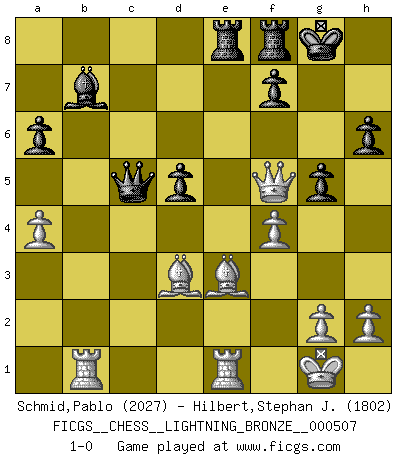 Last move : 1-0 2013 December 29 1:33:15 [Event "FICGS__CHESS__LIGHTNING_BRONZE__000507"] [Site "FICGS"] [Date "2013.12.29"] [Round "1"] [White "Schmid,Pablo"] [Black "Hilbert,Stephan J."] [Result "1-0"] [WhiteElo "2027"] [BlackElo "1802"] 1.d4 b5 2.e4 Bb7 3.Bd3 Nf6 4.Qe2 e6 5.Nf3 a6 6.a4 b4 7.O-O c5 8.e5 Nd5 9.dxc5 Bxc5 10.c4 bxc3 11.Nxc3 Nxc3 12.bxc3 Qc7 13.Re1 h6 14.Rb1 Nc6 15.Nd2 Na5 16.Ne4 Be7 17.Nd6+ Bxd6 18.exd6 Qxd6 19.c4 O-O 20.Bd2 Nxc4 21.Bxc4 Qc6 22.f3 d5 23.Bd3 g5 24.f4 e5 25.Qxe5 Rae8 26.Qf5 Qc5+ 27.Be3 1-0 Polish defense Kingside Castling by player White (move 7) Kingside Castling by player Black (move 19) Player White won this chess game. Follow this game move after move (download)The chessboard is the world, the pieces are the phenomena of the Universe, the rules of the game are what we call the laws of Nature and the player on the other side is hidden from us. (Thomas Huxley) Schach ist gnadenlos. Du mußt bereit sein zu töten. (Nigel Short) Después de la respuesta de las negras a 1.e4 con 1..e5, se quedan siempre tratando de entrar dentro del juego. (Howard Staunton) Vous n'êtes pas toujours obligé de jouer le meilleur coup. Un coup doit être actif, entreprenant, correct et beau ! (David Bronstein) O divine art of subtlety and secrecy! Through you we learn to be invisible, through you inaudible and hence we can hold the enemy's fate in our hands. (Sun Tzu)