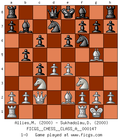 Last move : 1-0 2014 February 12 13:8:20 [Event "FICGS__CHESS__CLASS_A__000147"] [Site "FICGS"] [Date "2013.12.30"] [Round "1"] [White "Allies,Michael"] [Black "Sukhadolau,Dzmitry"] [Result "1-0"] [WhiteElo "2000"] [BlackElo "2000"] 1.d4 d5 2.c4 e6 3.Nf3 c6 4.Qc2 Nf6 5.Nc3 dxc4 6.e4 b5 7.Be2 Bb7 8.O-O Nbd7 9.Bg5 1-0 This chess game has been lost on time (started : 2013.12.30 13:6:46) Queen's gambit declined Kingside Castling by player White (move 8) Player White won this chess game. Follow this game move after move (download)Blessed be the memory of him who gave the world this immortal game. (A. G. Gardiner) Garry Kasparov war erst in der Großmeister-Organisation GMA, dann in der Profischach-Vereinigung PCA, zum Schluss kehrte er wieder in den Schoß der FIDE zurück. Aber gut, manche Leute sind flexibel (Viswanathan Anand) El Ajedrez es un terrible juego. Si no controlas el centro, tu oponente tiene una posición mas holgada. Si tienes control del centro, ¡entonces realmente tu tienes algo de que preocuparte!. (Siegbert Tarrasch) RxDa4 pat (...) A married woman is like a fish riding a bicycle. (Rodolfo d'Ettorre)