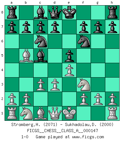Last move : 1-0 2014 February 14 13:7:50 [Event "FICGS__CHESS__CLASS_A__000147"] [Site "FICGS"] [Date "2013.12.30"] [Round "1"] [White "Stromberg,Hakan"] [Black "Sukhadolau,Dzmitry"] [Result "1-0"] [WhiteElo "2071"] [BlackElo "2000"] 1.e4 e5 2.Nf3 Nc6 3.Bb5 Nf6 4.d3 Bc5 5.c3 1-0 This chess game has been lost on time (started : 2013.12.30 13:6:46) Ruy Lopez : Berlin defense Player White won this chess game. Follow this game move after move (download)Those who say they understand Chess, understand nothing. (Robert Hubner) Du weisst es gibt ein Problem mit Computern und Fernschach, wenn jeder eine Rating von 2450 hat. (John Christen Knudsen) Debemos de asegurarnos de que el Ajedrez no se convierta en un lenguaje muerto, muy interesante, pero tan solo para un grupo muy pequeño. (Sytze Faber) Avant la finale, les dieux ont créé le milieu de partie. (Tarrasch) Good luck. You're gonna need it. (Han Solo in Star Wars ep.6)