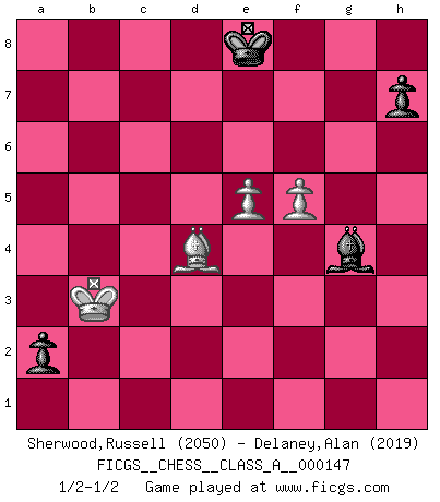 Last move : 1/2-1/2 2014 October 4 10:52:7 [Event "FICGS__CHESS__CLASS_A__000147"] [Site "FICGS"] [Date "2013.12.30"] [Round "1"] [White "Sherwood,Russell"] [Black "Delaney,Alan"] [Result "1/2-1/2"] [WhiteElo "2050"] [BlackElo "2019"] 1.e4 d6 2.d4 Nf6 3.Nc3 e5 4.Nf3 Nbd7 5.Bc4 Be7 6.O-O O-O 7.Re1 c6 8.a4 a5 9.h3 Nb6 10.Ba2 Nfd7 11.dxe5 dxe5 12.Be3 Qc7 13.Ng5 Nf6 14.Qd3 Nh5 15.Nf3 Nd7 16.Ne2 Nc5 17.Qc3 Nf6 18.Ng3 Nxa4 19.Qxe5 Qxe5 20.Nxe5 Nxb2 21.Reb1 Na4 22.Bxf7+ Rxf7 23.Rxa4 b5 24.R4a1 Ra6 25.Nxf7 Kxf7 26.Bc1 g6 27.Rb3 Nd7 28.Rf3+ Ke8 29.Re3 Ne5 30.Re1 Kf7 31.Bf4 Bf6 32.Ne2 Nc4 33.Rad1 a4 34.Nd4 b4 35.e5 Be7 36.Nf3 a3 37.Ra1 Be6 38.Ng5+ Bxg5 39.Bxg5 a2 40.Re2 Na3 41.Bc1 c5 42.Bb2 Ra4 43.f3 Nb5 44.Kf2 c4 45.Rc1 c3 46.Ba1 g5 47.g4 Ke7 48.R2e1 Bf7 49.h4 gxh4 50.Ke3 Na3 51.f4 Ra5 52.Re2 Rd5 53.Rh2 Rd2 54.Rxd2 Nc4+ 55.Ke2 cxd2 56.Rf1 Bd5 57.Bd4 h3 58.Bc5+ Ke8 59.Bg1 Be4 60.Be3 h2 61.Bd4 h1Q 62.Rxh1 Bxh1 63.f5 Bf3+ 64.Kd3 d1Q+ 65.Kxc4 Qxc2+ 66.Kxb4 Qb3+ 67.Kxb3 Bxg4 1/2-1/2 Pirc defense Kingside Castling by player White (move 6) Kingside Castling by player Black (move 6) Promotion Queen by player Black (move 61) Promotion Queen by player Black (move 64) 10 pieces endgame at move 66 : White KBPPP , Black KQBPP WHITE : King + 1 Bishop 3 Pawns BLACK : King + 1 Queen 1 Bishop 2 Pawns 9 pieces endgame at move 67 : White KBPPP , Black KBPP WHITE : King + 1 Bishop 3 Pawns BLACK : King + 1 Bishop 2 Pawns 8 pieces endgame at move 67 : White KBPP , Black KBPP WHITE : King + 1 Bishop 2 Pawns BLACK : King + 1 Bishop 2 Pawns This chess game ended in a draw. Follow this game move after move (download)Modern Chess is too much concerned with things like Pawn structure. Forget it, Checkmate ends the game. (Nigel Short) Wenn Schach ein enormer Dschungel ist, der seine Myriaden von Geheimnissen nicht preisgeben will, dann sind Computer die Kettensägen einer gewaltigen ökologisch unsensiblen Nutzholzfirma. (Nigel Short) ¿Que sería del Ajedrez sin errores graciosos?. (Kurt Richter) Donnez-moi un Cavalier en 6e et je gagnerais toutes mes parties. (Steinitz) Any activity becomes creative when the doer cares about doing it right or doing it better. (John Updike)