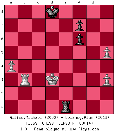 Last move : 1-0 2014 November 7 4:42:49 [Event "FICGS__CHESS__CLASS_A__000147"] [Site "FICGS"] [Date "2013.12.30"] [Round "1"] [White "Allies,Michael"] [Black "Delaney,Alan"] [Result "1-0"] [WhiteElo "2000"] [BlackElo "2019"] 1.d4 d6 2.e4 Nf6 3.Nc3 e5 4.dxe5 dxe5 5.Qxd8+ Kxd8 6.Nf3 Bd6 7.Be3 Ke7 8.h3 h6 9.O-O-O c6 10.Be2 Be6 11.Rxd6 Kxd6 12.Rd1+ Ke7 13.Nxe5 Nbd7 14.Nd3 Bc4 15.f4 Rhd8 16.b3 Bxd3 17.cxd3 Kf8 18.Bf3 Ne8 19.g4 Nc7 20.d4 b5 21.a3 Nb6 22.Kb2 Nc8 23.f5 a5 24.d5 cxd5 25.Bc5+ Ke8 26.exd5 Nd6 27.Ne4 Nxe4 28.Bxe4 Kd7 29.d6 Ne8 30.Bxa8 Rxa8 31.Kc3 a4 32.bxa4 Rxa4 33.Bb4 Ra6 34.Rd5 Nxd6 35.Bxd6 Rxd6 36.Rxb5 Rd1 37.Rb7+ Ke8 38.a4 Ra1 39.Rb4 Kd8 40.Kc4 h5 41.f6 gxf6 42.gxh5 Rh1 43.Rb3 Re1 44.Kd3 1-0 This chess game has been lost on time (started : 2013.12.30 13:6:46) Queen's Pawn Queenside Castling by player White (move 9) 10 pieces endgame at move 41 : White KRPPP , Black KRPPP WHITE : King + 1 Rook 3 Pawns BLACK : King + 1 Rook 3 Pawns 9 pieces endgame at move 42 : White KRPPP , Black KRPP WHITE : King + 1 Rook 3 Pawns BLACK : King + 1 Rook 2 Pawns Player White won this chess game. Follow this game move after move (download)Good positions don't win games, good moves do. (Gerald Abrahams) Schach ist mein Leben, meine Leidenschaft, was ich gelernt habe und seit meinem 14. Lebensjahr profimässig praktiziere. Darauf zu verzichten, würde mir sehr schwer fallen. (Viktor Kortschnoi) El Ajedrez es la vida. (Bobby Fischer) En blitz, le Cavalier l'emporte sur le Fou. (Vlastimil Hort) Question: Is 'This statement is paradoxical' a paradoxical statement ? Or is it a meta-paradox ? (Normajean Yates)