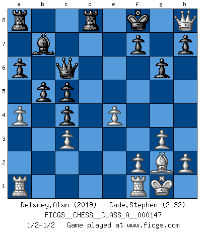 Last move : 1/2-1/2 2014 April 12 12:25:15 [Event "FICGS__CHESS__CLASS_A__000147"] [Site "FICGS"] [Date "2013.12.30"] [Round "1"] [White "Delaney,Alan"] [Black "Cade,Stephen"] [Result "1/2-1/2"] [WhiteElo "2019"] [BlackElo "2132"] 1.d4 d5 2.c4 c6 3.Nf3 Nf6 4.Nc3 e6 5.g3 dxc4 6.Bg2 b5 7.Ne5 Nd5 8.O-O Bb7 9.a4 a6 10.e4 Nxc3 11.bxc3 Nd7 12.Bf4 Be7 13.Qg4 g6 14.Nxd7 Qxd7 15.Bh6 e5 16.Qf3 exd4 17.Bg7 Rg8 18.Bxd4 c5 19.Bf6 Qc6 20.Bxe7 Kxe7 21.Qf4 Rgd8 22.Qe5+ Kf8 23.Qh8+ 1/2-1/2 QGD Slav : 4.Nc3 Kingside Castling by player White (move 8) This chess game ended in a draw. Follow this game move after move (download)Even the laziest King flees wildly in the face of a double check ! (Aaron Nimzowitsch) Oft bringt ein stiller Zug das Erdbeben. (Richard Reti) Uno no tiene que jugar muy bien, es suficiente jugar mejor que el oponente. (Siegbert Tarrasch) Soyez une menace à chaque fois que vous vous asseyez pour jouer. (Ken Smith) Thibault, I ask for draw. Game 13876. - Sorry Ilmars, you won. (FICGS chat)