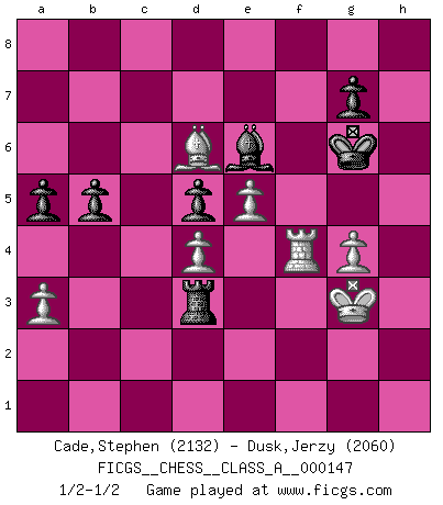 Last move : 1/2-1/2 2014 February 27 21:12:16 [Event "FICGS__CHESS__CLASS_A__000147"] [Site "FICGS"] [Date "2013.12.30"] [Round "1"] [White "Cade,Stephen"] [Black "Dusk,Jerzy"] [Result "1/2-1/2"] [WhiteElo "2132"] [BlackElo "2060"] 1.d4 Nf6 2.c4 e6 3.Nc3 Bb4 4.e3 O-O 5.Bd3 d5 6.Nf3 c5 7.O-O Nc6 8.a3 Bxc3 9.bxc3 dxc4 10.Bxc4 Qc7 11.Bb2 b6 12.Bd3 Na5 13.e4 Bb7 14.Re1 Rfd8 15.Rb1 Rac8 16.Nd2 Qd7 17.e5 Qd5 18.f3 Ne8 19.Re4 Nc6 20.Rh4 h6 21.Nc4 Qd7 22.Qe1 cxd4 23.cxd4 Ne7 24.Ne3 Ng6 25.Bxg6 fxg6 26.Rg4 Kh7 27.Qe2 Nc7 28.Qd3 Qf7 29.h4 Ba6 30.Qe4 Nd5 31.h5 Kg8 32.hxg6 Qe8 33.Nxd5 exd5 34.Qf5 Rc6 35.Rg3 Bc8 36.Qh5 Qd7 37.Re1 Qf5 38.Qh4 Re8 39.Bc1 Qf8 40.Kh2 Bf5 41.Bd2 Bxg6 42.Rc1 R8e6 43.Bb4 Qf7 44.Rxc6 Rxc6 45.Qd8+ Kh7 46.Bf8 Rc4 47.Rg4 h5 48.Rh4 Rc2 49.Qe7 Rc8 50.Qxf7 Bxf7 51.Be7 Re8 52.Bg5 Kg6 53.Bd2 Rc8 54.Bb4 a5 55.Be7 Rc3 56.Kg3 Rd3 57.Bd6 Be6 58.Rf4 Bf5 59.Rh4 Bd7 60.Rf4 Be6 61.Kh4 Rd2 62.g4 hxg4 63.fxg4 b5 64.Kg3 Rd3+ 1/2-1/2 Nimzo-Indian : 4.e3 O-O, 5.Bd3 d5 Kingside Castling by player Black (move 4) Kingside Castling by player White (move 7) This chess game ended in a draw. Follow this game move after move (download)My style is somewhere between that of Tal and Petrosian. (Reshevsky) Es ist besser die Steine des Gegners zu opfern. (Savielly Grigorievitsch Tartakower) El Ajedrez es un expediente tonto que hace creer a la gente inactiva que hacen una cosa muy astuta cuando solamente estan perdiendo su tiempo. (George Bernard Shaw) Shah mat. Le roi est mort. Cri de fierté d'un joueur venant de terrasser son adversaire, courtoisement, sans effusion de sang. Real knowledge is to know the extent of one's ignorance. (Confucius)