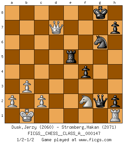 Last move : 1/2-1/2 2014 March 28 9:24:38 [Event "FICGS__CHESS__CLASS_A__000147"] [Site "FICGS"] [Date "2013.12.30"] [Round "1"] [White "Dusk,Jerzy"] [Black "Stromberg,Hakan"] [Result "1/2-1/2"] [WhiteElo "2060"] [BlackElo "2071"] 1.e4 c5 2.Nf3 d6 3.d4 cxd4 4.Nxd4 Nf6 5.Nc3 a6 6.Bg5 e6 7.f4 Be7 8.Qf3 Qc7 9.O-O-O Nbd7 10.g4 b5 11.Bxf6 Nxf6 12.g5 Nd7 13.f5 O-O 14.Rg1 b4 15.Nce2 e5 16.f6 exd4 17.fxe7 Re8 18.Nxd4 Ne5 19.Qf4 g6 20.h4 d5 21.Kb1 dxe4 22.h5 Qxe7 23.Bg2 Bg4 24.Rde1 Rad8 25.Rxe4 gxh5 26.Rge1 Qd7 27.b3 Ng6 28.Qf6 Rxe4 29.Rxe4 Rc8 30.Re3 Rf8 31.Re4 Qd8 32.Nc6 Qd2 33.Bf3 Bxf3 34.Qxf3 h4 35.Nxb4 Qxg5 36.Nxa6 Rd8 37.Nb4 f5 38.Re3 f4 39.Re1 Qg3 40.Qe2 h3 41.Rh1 Kg7 42.Nd3 Qg2 43.Nf2 h2 44.Qc4 Re8 45.Qd4+ Re5 46.Qd7+ Kg8 1/2-1/2 Sicilian : Najdorf, 7...Be7 Queenside Castling by player White (move 9) Kingside Castling by player Black (move 13) This chess game ended in a draw. Follow this game move after move (download)No Chess Grandmaster is normal; they only differ in the extent of their madness. (Viktor Korchnoi) Es war undenkbar für die Behörden, dass ein sowjetischer Großmeister auf diese Art und Weise [Fischer-Taimanov 6:0] verliert, ohne dass es eine politischer Erklärung dafür gäbe. (Mark Taimanov) Yo siempre he tenido un ligero sentimiento de lástima por una persona que no tiene conocimiento del Ajedrez. (Siegbert Tarrasch) La vie est comme un jeu d'échecs : nous esquissons un plan, mais celui-ci est tributaire de ce que daignent faire l'adversaire aux échecs et le destin dans la vie. (Arthur Schopenhauer) We need strong personalities and only one world champion to attract sponsors. (Anatoly Karpov)