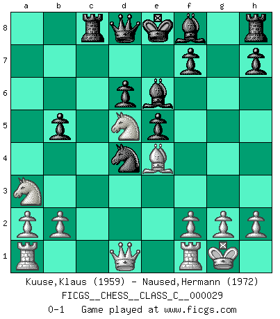 Last move : 0-1 2007 July 8 22:19:10 [Event "FICGS__CHESS__CLASS_C__000029"] [Site "FICGS"] [Date "2007.02.11"] [Round "1"] [White "Kuuse,Klaus"] [Black "Naused,Hermann"] [Result "0-1"] [WhiteElo "1959"] [BlackElo "1972"] 1.e4 c5 2.Nf3 Nc6 3.d4 cxd4 4.Nxd4 Nf6 5.Nc3 e5 6.Ndb5 d6 7.Bg5 a6 8.Na3 b5 9.Bxf6 gxf6 10.Nd5 f5 11.Bd3 Be6 12.O-O Rc8 13.c4 Nd4 14.cxb5 fxe4 15.Bxe4 axb5 0-1 This chess game has been lost on time (started : 2007.02.11 0:29:39) Sicilian : Pelikan (Lasker/Sveshnikov) variation Kingside Castling by player White (move 12) Player Black won this chess game. Follow this game move after move (download)My opponents make good moves too. Sometimes I don't take these things into consideration. (Bobby Fischer) Ich las kürzlich ein Buch von Nietzsche. Er sagte Religion verdumme nur die Menschen. Ich stimme zu. (Robert James Fischer) Vive, pierde y aprende al observar a tu oponente como ganar. (Amber Steenbock) J'apprécie les joueurs d'est-indienne, c'est grâce à eux que je nourris ma famille depuis tant d'années. (Petrosian) There are more things in heaven and earth than practically anywhere else. (Unknown)