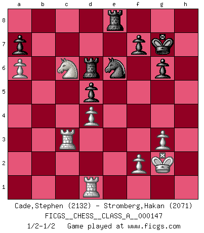 Last move : 1/2-1/2 2014 March 19 15:27:1 [Event "FICGS__CHESS__CLASS_A__000147"] [Site "FICGS"] [Date "2013.12.30"] [Round "1"] [White "Cade,Stephen"] [Black "Stromberg,Hakan"] [Result "1/2-1/2"] [WhiteElo "2132"] [BlackElo "2071"] 1.d4 d5 2.c4 c6 3.Nf3 Nf6 4.Nc3 e6 5.Bg5 Nbd7 6.cxd5 exd5 7.e3 Be7 8.Qc2 Nh5 9.Bxe7 Qxe7 10.h3 O-O 11.Bd3 Nhf6 12.O-O g6 13.Rae1 Nb6 14.Ne5 Ne8 15.e4 dxe4 16.Nxe4 Qd8 17.Re2 Bf5 18.Rd1 Bxe4 19.Bxe4 Nc7 20.a4 Nbd5 21.Qb3 Rb8 22.g3 Re8 23.h4 Re7 24.h5 Qd6 25.Bf3 Ne6 26.Bxd5 Qxd5 27.Qxd5 cxd5 28.Ng4 Kf8 29.Re5 Rd8 30.Kg2 Rc7 31.a5 Rc6 32.b3 Rcd6 33.b4 Ng7 34.hxg6 hxg6 35.Re3 Ne6 36.Rc3 Kg7 37.Ne5 Re8 38.b5 R6d8 39.a6 bxa6 40.bxa6 Rd6 41.Nc6 Rd7 42.Ne5 Rd6 43.Nc6 1/2-1/2 QGD Slav : 4.Nc3 Kingside Castling by player Black (move 10) Kingside Castling by player White (move 12) This chess game ended in a draw. Follow this game move after move (download)I played Chess with him and would have beaten him sometimes only he always took back his last move, and ran the game out differently. (Mark Twain) Im Schach nämlich geht es darum, daß Ich des Gegners klein zu kriegen, sein Ego zu zerbrechen und zu zermahlen, seine Selbstachtung zu zertreten und zu verscharren und seine ganze mißachtenswerte sogenannte Persönlichkeit ein für alle Mal tot zu hacken und zu zerstampfen und dadurch die menschliche Gesellschaft von einer stinkenden Pestbeule zu befreien. Es ist ein königliches Spiel. (Robert James Fischer) ¿Porque tengo que perder ante este idiota?. (Aron Nimzovich) On peut tirer plus d'utilité d'une partie perdue que de 100 parties gagnées. (Capablanca) In God we trust, all others we virus scan. (Anonymous)