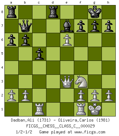 Last move : 1/2-1/2 2007 March 9 23:17:32 [Event "FICGS__CHESS__CLASS_C__000029"] [Site "FICGS"] [Date "2007.02.11"] [Round "1"] [White "Dadban,Ali"] [Black "Oliveira,Carlos"] [Result "1/2-1/2"] [WhiteElo "1731"] [BlackElo "1981"] 1.Nf3 Nf6 2.c4 e6 3.Nc3 Be7 4.e4 c5 5.d4 cxd4 6.Nxd4 Nc6 7.Be3 O-O 8.Be2 a6 9.O-O Qc7 10.Rc1 b6 11.Nd5 exd5 12.cxd5 Bb7 13.dxc6 dxc6 14.Bf3 c5 15.e5 Bxf3 16.Nxf3 Rfd8 17.Qc2 Nd5 18.Qe4 Nxe3 19.Qxe3 Qb7 20.e6 1/2-1/2 Reti Opening Kingside Castling by player Black (move 7) Kingside Castling by player White (move 9) This chess game ended in a draw. Follow this game move after move (download)Those who say they understand Chess, understand nothing. (Robert Hubner) Besser ein falscher Plan, logisch durchgeführt, als gar kein Plan. (Viktor Kortschnoi) Tu no necesitas jugar muy bien, únicamente ayudar a tu oponenet a que juegue muy mal. (Genrikh Chepukaitis) Une platitude souvent récitée à propos des Echecs est qu'une des choses les plus difficiles à réaliser est de gagner une position gagnante. Cela ne manque pas de sens mais, pour ma part, j'ai toujours trouvé plus difficile de gagner une position perdante. (Tim Krabbe) Luck is when opportunity knocks and you answer. (Anonymous)