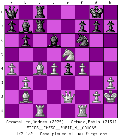 Last move : 1/2-1/2 2014 March 16 20:43:56 [Event "FICGS__CHESS__RAPID_M__000069"] [Site "FICGS"] [Date "2013.12.30"] [Round "1"] [White "Grammatica,Andrea"] [Black "Schmid,Pablo"] [Result "1/2-1/2"] [WhiteElo "2229"] [BlackElo "2151"] 1.d4 d5 2.c4 c6 3.Nf3 Nf6 4.e3 e6 5.b3 Nbd7 6.Bb2 Bd6 7.Bd3 O-O 8.Nbd2 b6 9.O-O Bb7 10.Ne5 c5 11.cxd5 exd5 12.f4 cxd4 13.exd4 Ne4 14.Nxe4 dxe4 15.Bc4 Nf6 16.Qe2 Rc8 17.Rac1 Rc7 18.h3 Qa8 19.Kh2 Rfc8 20.a4 1/2-1/2 QGD Slav : 4.e3 Kingside Castling by player Black (move 7) Kingside Castling by player White (move 9) This chess game ended in a draw. Follow this game move after move (download)Of Chess it has been said that life is not long enough for it, but that is the fault of life, not Chess. (William Ewart Napier) Im Schach gewinnt jeder. Hat man Freunde am Spiel - und das ist die Hauptsache - ist auch der Verlust einer Partie kein Unglück. (David Bronstein) Aún deseo matar a Fischer. (Boris Spassky) Les échecs sont un jeu terrible. Si vous n'avez pas le centre, votre adversaire a une position plus libre. Par contre, si vous avez le centre, alors vous avez vraiment quelque chose pour laquelle vous inquiéter ! (Siegbert Tarrasch) When you have everything, sometimes it feels like nothing. (Horatio Caine, C.S.I. Miami)