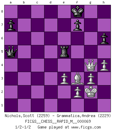 Last move : 1/2-1/2 2014 January 20 22:48:16 [Event "FICGS__CHESS__RAPID_M__000069"] [Site "FICGS"] [Date "2013.12.30"] [Round "1"] [White "Nichols,Scott"] [Black "Grammatica,Andrea"] [Result "1/2-1/2"] [WhiteElo "2259"] [BlackElo "2229"] 1.d4 Nf6 2.Nf3 g6 3.c4 Bg7 4.g3 d5 5.cxd5 Nxd5 6.Bg2 Nb6 7.Nc3 Nc6 8.Bf4 O-O 9.e3 h6 10.h4 Bg4 11.Rc1 e5 12.dxe5 Nc4 13.Nd5 Nxb2 14.Qb3 Bxf3 15.Bxf3 Nxe5 16.Bxe5 Bxe5 17.Nf4 c6 18.Nxg6 Nd3+ 19.Ke2 Nxc1+ 20.Rxc1 Re8 21.Nxe5 Rxe5 22.Qxb7 Rb8 23.Qxc6 Rb2+ 24.Rc2 Qd4 25.Qc8+ Kg7 26.Rxb2 Qxb2+ 27.Kf1 Qxa2 28.Qg4+ Kh7 29.Kg2 Qa5 30.Qd7 Kg7 31.Qg4+ Kf8 1/2-1/2 King's Indian : East Indian defense Kingside Castling by player Black (move 8) This chess game ended in a draw. Follow this game move after move (download)Look at Garry Kasparov. After he loses, invariably he wins the next game. He just kills the next guy. That's something that we have to learn to be able to do. (Maurice Ashley) Über Karpov: Er war und ist ein Vertreter der russischen Reaktionäre. Das steckt tief in seiner Seele, wehalb ich nicht nett mit ihm umgehen kann. (Viktor Kortschnoi) ¿Porque tengo que perder ante este idiota?. (Aron Nimzovich) Horreur, mais aussi harmonie suprême : qu'y avait-il en effet au monde en dehors des échecs ? Le brouillard, l'inconnu, le non-être... (Vladimir Nabokov) Lamb in skin of tiger, still fears the wolf. (Chinese proverb)