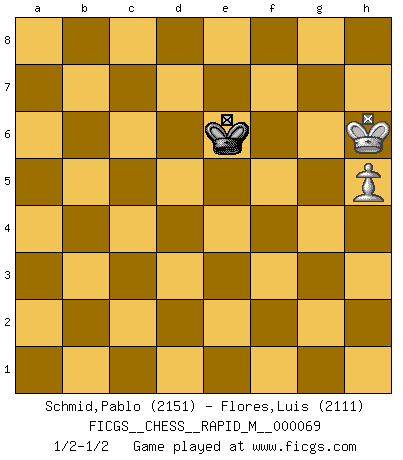 Last move : 1/2-1/2 2014 April 22 4:58:32 [Event "FICGS__CHESS__RAPID_M__000069"] [Site "FICGS"] [Date "2013.12.30"] [Round "1"] [White "Schmid,Pablo"] [Black "Flores,Luis"] [Result "1/2-1/2"] [WhiteElo "2151"] [BlackElo "2111"] 1.d4 Nf6 2.c4 e6 3.Nf3 d5 4.Nc3 c6 5.Bg5 h6 6.Bh4 dxc4 7.e4 g5 8.Bg3 b5 9.Be2 Bb7 10.O-O Nbd7 11.Ne5 Bg7 12.Nxd7 Nxd7 13.Bd6 a6 14.a4 e5 15.Bg4 exd4 16.e5 c5 17.Re1 Nxe5 18.Bxe5 O-O 19.Bxg7 Kxg7 20.Ne2 f5 21.Bh5 f4 22.Nxd4 cxd4 23.Re6 Rf6 24.Qe1 Bd5 25.Re7+ Kg8 26.axb5 Qd6 27.h3 a5 28.Bg4 Bf7 29.Rd7 Qb6 30.Qe4 Ra7 31.Qxd4 Rxd7 32.Qxb6 Rxb6 33.Bxd7 Rd6 34.Bc6 Kf8 35.Rxa5 Bd5 36.h4 Ke7 37.Ra6 Bxc6 38.bxc6 Kd8 39.Ra5 Rd1+ 40.Kh2 Rd2 41.f3 g4 42.fxg4 f3 43.Kg3 fxg2 44.Kh2 Rd4 45.Kxg2 Rxg4+ 46.Kh3 Re4 47.Rc5 Kc7 48.Kg3 Rd4 49.h5 Rd2 50.Rxc4 Rxb2 51.Rc5 Rb6 52.Kf4 Rxc6 53.Rxc6+ Kxc6 54.Kf5 Kd5 55.Kg6 Ke6 56.Kxh6 1/2-1/2 Queen's pawn game Kingside Castling by player White (move 10) Kingside Castling by player Black (move 18) 10 pieces endgame at move 45 : White KRPPPP , Black KRPP WHITE : King + 1 Rook 4 Pawns BLACK : King + 1 Rook 2 Pawns 9 pieces endgame at move 45 : White KRPPP , Black KRPP WHITE : King + 1 Rook 3 Pawns BLACK : King + 1 Rook 2 Pawns 8 pieces endgame at move 50 : White KRPPP , Black KRP WHITE : King + 1 Rook 3 Pawns BLACK : King + 1 Rook 1 Pawn 7 pieces endgame at move 50 : White KRPP , Black KRP WHITE : King + 1 Rook 2 Pawns BLACK : King + 1 Rook 1 Pawn 6 pieces endgame at move 52 : White KRP , Black KRP WHITE : King + 1 Rook 1 Pawn BLACK : King + 1 Rook 1 Pawn 5 pieces endgame at move 53 : White KRP , Black KP WHITE : King + 1 Rook 1 Pawn BLACK : King + 1 Pawn 4 pieces endgame at move 53 : White KP , Black KP WHITE : King + 1 Pawn BLACK : King + 1 Pawn 3 pieces endgame at move 56 : White KP , Black K WHITE : King + 1 Pawn BLACK : King + This chess game ended in a draw. Follow this game move after move (download)I like the moment when I break a man's ego. (Bobby Fischer) Im Internet Chess Club betrug mein Rating vorübergehend 3350 ELO-Punkte. (Sergej Karjakin) El Ajedrez es una manera fabulosa para que los niños aprendan a autovalorarse y a autoestimarse. (Saudin Robovic) Tous ces prétendus hommes politiques sont les pions, les Cavaliers, les Tours ou les Fous d'une partie d'échecs qui se jouera tant qu'un hasard ne renversera pas l'échiquier. (Honoré de Balzac) Men never do evil so completely and cheerfully as when they do it from religious conviction. (Blaise Pascal)