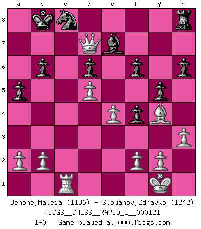 Last move : 1-0 2014 January 5 14:45:57 [Event "FICGS__CHESS__RAPID_E__000121"] [Site "FICGS"] [Date "2013.12.31"] [Round "1"] [White "Benone,Mateia"] [Black "Stoyanov,Zdravko"] [Result "1-0"] [WhiteElo "1186"] [BlackElo "1242"] 1.Nf3 d6 2.d4 h6 3.e4 Bg4 4.h3 Bh5 5.c4 Nc6 6.Be3 e6 7.Nc3 Nge7 8.Be2 Bxf3 9.Bxf3 Ng6 10.O-O e5 11.d5 Nce7 12.Re1 Nh4 13.Bg4 Nc8 14.Qa4+ Ke7 15.c5 f6 16.Qb3 b6 17.cxd6+ cxd6 18.Qd1 Ng6 19.Bh5 Nf4 20.Bxf4 exf4 21.Ne2 g5 22.Nd4 a5 23.Nc6+ Kd7 24.Nxd8 Kxd8 25.Qa4 Be7 26.Bg4 Ra7 27.Rec1 Rc7 28.Rxc7 Kxc7 29.Qd7+ Kb8 30.Rc1 1-0 Reti Opening Kingside Castling by player White (move 10) Player White won this chess game. Follow this game move after move (download)Fischer is an American Chess tragedy on par with Morphy and Pillsbury. (Mig Greengard) Du musst nicht gut spielen, es reicht, wenn du besser spielst als dein Gegner. (Anonymous) Todo se encuentra en un estado de flujo y esto incluye al mundo del Ajedrez. (Mikhail Botvinnik) Les Echecs sont affaire de jugement sensible. Savoir quand frapper et quand esquiver. (Fischer) God is an atheist. (Unknown)