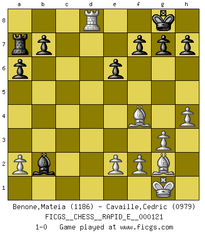 Last move : 1-0 2014 February 8 16:50:19 [Event "FICGS__CHESS__RAPID_E__000121"] [Site "FICGS"] [Date "2013.12.31"] [Round "1"] [White "Benone,Mateia"] [Black "Cavaille,Cedric"] [Result "1-0"] [WhiteElo "1186"] [BlackElo "0979"] 1.Nf3 c5 2.c4 Nc6 3.Nc3 Nf6 4.d4 cxd4 5.Nxd4 Nxd4 6.Qxd4 e6 7.g3 d5 8.Bg2 dxc4 9.Qxc4 Bd6 10.Bg5 O-O 11.Rd1 Qc7 12.Qxc7 Bxc7 13.O-O Bd8 14.Bf4 Be7 15.Rd3 Rd8 16.Rfd1 Rxd3 17.Rxd3 a6 18.Na4 Ra7 19.Nb6 Bd7 20.Nxd7 Nxd7 21.Rxd7 Bf6 22.h4 Bxb2 23.Rd8+ 1-0 Reti Opening Kingside Castling by player Black (move 10) Kingside Castling by player White (move 13) Player White won this chess game. Follow this game move after move (download)First-class players lose to second-class players because second-class players sometimes play a first-class game. (Siegbert Tarrasch) Schach ist Krieg, im Schach geht es um testosterongesteuerte Urschreie. (Garry Kasparov) Yo he agregado estos principios a la ley: pongan los Caballos en acción antes de que los dos Alfiles sean desarrollados. (Emanuel Lasker) Ce n'est pas pour s'amuser qu'il joue aux échecs : il célèbre un culte. (Vladimir Nabokov) Winning isn't everything... but losing is nothing. (Mednis)
