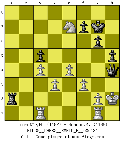 Last move : 0-1 2014 February 18 11:58:13 [Event "FICGS__CHESS__RAPID_E__000121"] [Site "FICGS"] [Date "2013.12.31"] [Round "1"] [White "Leurette,Marc-Antoine"] [Black "Benone,Mateia"] [Result "0-1"] [WhiteElo "1182"] [BlackElo "1186"] 1.e4 c5 2.Nc3 Nc6 3.Nf3 g6 4.Bb5 Bg7 5.Bxc6 dxc6 6.d3 Bg4 7.h3 Nf6 8.hxg4 Nxg4 9.Qe2 h5 10.Be3 Qa5 11.O-O Nxe3 12.Qxe3 Bxc3 13.bxc3 Qxc3 14.Rfc1 b6 15.Qf4 Qf6 16.Qc7 Qd6 17.Qb7 O-O 18.Rd1 e5 19.a4 Rab8 20.Qa6 Rfe8 21.Qxa7 Ra8 22.Qxb6 Reb8 23.Qxb8+ Qxb8 24.c4 Qb3 25.Nxe5 Rxa4 26.Rab1 Qc3 27.Nxc6 Ra2 28.Ne7+ Kg7 29.Rbc1 Qf6 30.f3 Qd4+ 31.Kh2 Qf2 32.Rg1 Qh4+ 0-1 Sicilian : Closed, 2...Nc6 Kingside Castling by player White (move 11) Kingside Castling by player Black (move 17) Player Black won this chess game. Follow this game move after move (download)In Chess, as it is played by masters, chance is practically eliminated. (Emanuel Lasker) Mein Gehirn das ist mein zweitwichtigstes Organ [Aus dem Film: Der Schläfer]. (Woody Allen) No nos podemos resistir a la fascinación de un sacrificio ya que la pasión por los sacrificios es parte de la naturaleza de un jugador de Ajedrez. (Rudolf Spielman) Les échecs sont un jeu terrible. Si vous n'avez pas le centre, votre adversaire a une position plus libre. Par contre, si vous avez le centre, alors vous avez vraiment quelque chose pour laquelle vous inquiéter ! (Siegbert Tarrasch) Wikichess, chess moves explained by 'experimented' players. (Thibault de Vassal)