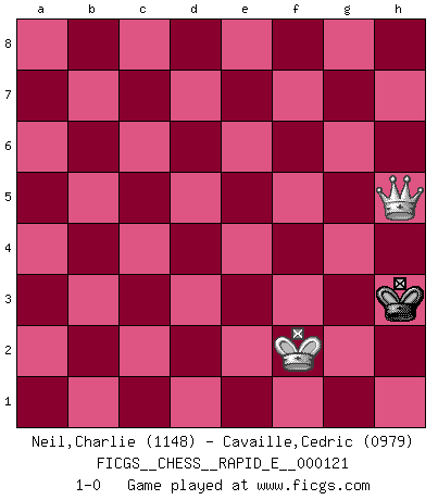 Last move : 1-0 2014 January 23 17:45:5 [Event "FICGS__CHESS__RAPID_E__000121"] [Site "FICGS"] [Date "2013.12.31"] [Round "1"] [White "Neil,Charlie"] [Black "Cavaille,Cedric"] [Result "1-0"] [WhiteElo "1148"] [BlackElo "0979"] 1.e4 e5 2.Nf3 Nc6 3.Bc4 h6 4.d4 exd4 5.Nxd4 Nxd4 6.Qxd4 d6 7.Nc3 Qf6 8.Qxf6 Nxf6 9.Bf4 Be6 10.Bd3 O-O-O 11.O-O-O d5 12.exd5 Nxd5 13.Nxd5 Bxd5 14.Bf5+ Kb8 15.c4 g6 16.Bc2 g5 17.Be3 c6 18.cxd5 Rxd5 19.Rxd5 cxd5 20.Rd1 Bd6 21.g3 b6 22.Bf5 Kc7 23.Rxd5 Kc6 24.Rd3 f6 25.Be4+ Kc7 26.Rc3+ Kd7 27.Rd3 Rc8+ 28.Kb1 Ke6 29.g4 Bc5 30.Rc3 Ke5 31.Bf5 Rc7 32.Bxc5 Rxc5 33.Rxc5+ bxc5 34.Kc2 Kf4 35.Kc3 Kf3 36.Kc4 Kxf2 37.Kxc5 Kg2 38.b4 Kxh2 39.a4 Kh3 40.b5 Kh4 41.a5 h5 42.b6 axb6+ 43.axb6 hxg4 44.b7 g3 45.Be4 Kh3 46.b8Q g2 47.Bf5+ g4 48.Qb1 Kh2 49.Qb8+ Kh1 50.Qh8+ Kg1 51.Qxf6 Kh2 52.Qh4+ Kg1 53.Qe1+ Kh2 54.Qh4+ Kg1 55.Bxg4 Kf1 56.Bh3 Kg1 57.Bxg2 Kxg2 58.Qf4 Kg1 59.Kd4 Kg2 60.Ke3 Kh3 61.Qg5 Kh2 62.Kf2 Kh3 63.Qh5+ 1-0 King's pawn game Queenside Castling by player Black (move 10) Queenside Castling by player White (move 11) 10 pieces endgame at move 38 : White KBPPP , Black KPPPP WHITE : King + 1 Bishop 3 Pawns BLACK : King + 4 Pawns 9 pieces endgame at move 42 : White KBPP , Black KPPPP WHITE : King + 1 Bishop 2 Pawns BLACK : King + 4 Pawns 8 pieces endgame at move 43 : White KBPP , Black KPPP WHITE : King + 1 Bishop 2 Pawns BLACK : King + 3 Pawns 7 pieces endgame at move 43 : White KBP , Black KPPP WHITE : King + 1 Bishop 1 Pawn BLACK : King + 3 Pawns Promotion Queen by player White (move 46) 6 pieces endgame at move 51 : White KQB , Black KPP WHITE : King + 1 Queen 1 Bishop BLACK : King + 2 Pawns 5 pieces endgame at move 55 : White KQB , Black KP WHITE : King + 1 Queen 1 Bishop BLACK : King + 1 Pawn 4 pieces endgame at move 57 : White KQB , Black K WHITE : King + 1 Queen 1 Bishop BLACK : King + 3 pieces endgame at move 57 : White KQ , Black K WHITE : King + 1 Queen BLACK : King + Player White won this chess game. Follow this game move after move (download)Those who say they understand Chess, understand nothing. (Robert Hubner) Schach ist ein Kampf gegen den Fehler. (Johannes Herrman Zukertort) El Jaque al descubierto es el bombardero del tablero. (Reuben Fine) Aidez vos pièces, elles vous aideront. (Paul Morphy) Is not life a hundred times too short to bore ourselves ? (Friedrich Nietzsche)