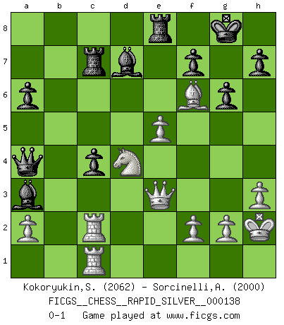 Last move : 0-1 2014 March 30 18:55:19 [Event "FICGS__CHESS__RAPID_SILVER__000138"] [Site "FICGS"] [Date "2014.01.01"] [Round "1"] [White "Kokoryukin,Sergey"] [Black "Sorcinelli,Andrea"] [Result "0-1"] [WhiteElo "2062"] [BlackElo "2000"] 1.e4 e5 2.Nf3 Nc6 3.Bb5 a6 4.Ba4 Nf6 5.O-O Be7 6.Re1 b5 7.Bb3 d6 8.c3 O-O 9.d4 Bg4 10.Be3 exd4 11.cxd4 d5 12.e5 Ne4 13.Nc3 Nxc3 14.bxc3 Na5 15.Bc2 Nc4 16.Qd3 g6 17.Bh6 Re8 18.h3 Be6 19.Qe2 c5 20.Bd3 Rc8 21.Bxc4 dxc4 22.Rad1 cxd4 23.Nxd4 Qb6 24.Be3 Bf8 25.Qf3 Qc7 26.Bg5 b4 27.cxb4 Bxb4 28.Re2 Qd7 29.Rc2 Bf8 30.Bf6 Qa4 31.Qe3 Bd7 32.Rdc1 Rc7 33.Kh2 Ba3 0-1 This chess game has been lost on time (started : 2014.01.01 21:50:37) Ruy Lopez : Closed Kingside Castling by player White (move 5) Kingside Castling by player Black (move 8) Player Black won this chess game. Follow this game move after move (download)A man without frontiers. He didn't divide the East and the West, he brought them together in their admiration for him. (Ljubomir Ljubojevic, about Bobby Fischer's death) Ich bin es gewohnt, das die Jugend mir überhaupt keinen Respekt entgegenbringt. (Alexander Morozewich) El tablero es el mundo, las piezas es el fenomeno del universo, las reglas del juego son lo que llamamos leyes de la naturaleza y el jugador del lado opuesto, se encuentra oculto a nuestra vista. (Thomas Huxley) La tactique, c'est ce que vous faites quand il y a quelque chose à faire; la stratégie, c'est ce que vous faites quand il n'y a rien à faire. (Savielli Tartacower) I don't believe in psychology. I believe in good moves. (Bobby Fischer)