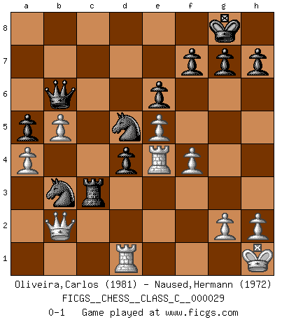 Last move : 0-1 2007 August 11 19:2:8 [Event "FICGS__CHESS__CLASS_C__000029"] [Site "FICGS"] [Date "2007.02.11"] [Round "1"] [White "Oliveira,Carlos"] [Black "Naused,Hermann"] [Result "0-1"] [WhiteElo "1981"] [BlackElo "1972"] 1.b3 e6 2.Bb2 d5 3.e3 c5 4.Bb5+ Bd7 5.Bxd7+ Qxd7 6.Nf3 Nf6 7.O-O Nc6 8.d4 cxd4 9.exd4 Bd6 10.c4 O-O 11.Nc3 a6 12.c5 Bc7 13.Re1 Rac8 14.Ne5 Qe7 15.f4 Qd8 16.a3 Nd7 17.b4 Bxe5 18.dxe5 b6 19.cxb6 Qxb6+ 20.Kh1 a5 21.b5 Ne7 22.a4 Rc4 23.Rc1 Rfc8 24.Qd2 Nc5 25.Qe2 Nb3 26.Rcd1 Rxc3 27.Bxc3 Rxc3 28.Qb2 d4 29.Re4 Nd5 0-1 Nimzovich-Larsen attack Kingside Castling by player White (move 7) Kingside Castling by player Black (move 10) Player Black won this chess game. Follow this game move after move (download)Fischer, who may or may not be mad as a hatter, has every right to be horrified. (Jeremy Silman) Heutzutage gewinnt im Turnier nicht derjenige Spieler, der weitreichende Pläne entwirft, sondern einfach jener, der Zug um Zug kämpft. (David Bronstein) No todos los artistas son jugadores de Ajedrez, pero todos los jugadores de Ajedrez son artistas. (Marcel Duchamp) La tactique, c'est ce que vous faites quand il y a quelque chose à faire; la stratégie, c'est ce que vous faites quand il n'y a rien à faire. (Savielli Tartacower) Chess is as much a mystery as women. (Purdy)