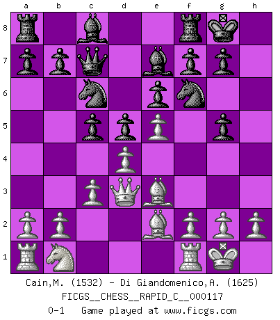 Last move : 0-1 2014 February 27 2:19:22 [Event "FICGS__CHESS__RAPID_C__000117"] [Site "FICGS"] [Date "2014.01.02"] [Round "1"] [White "Cain,Maurie"] [Black "Di Giandomenico,Alfonso"] [Result "0-1"] [WhiteElo "1532"] [BlackElo "1625"] 1.e4 c5 2.c3 e6 3.d4 Nc6 4.Nf3 Nf6 5.Qd3 Be7 6.Be2 O-O 7.O-O Qc7 8.Be3 d5 9.Ng5 h6 10.e5 hxg5 0-1 This chess game has been lost on time (started : 2014.01.02 8:36:12) Sicilian : Alapin's variation (2.c3) Kingside Castling by player Black (move 6) Kingside Castling by player White (move 7) Player Black won this chess game. Follow this game move after move (download)There's never before been a Chess player with such a thorough knowledge of the intricacies of the game and such an absolutely indomitable will to win. I think Bobby is the greatest player that ever lived. (Lisa Lane) Obendrein hat der FIDE-Präsident den Revolutionsführer Gaddafi zum »Großmeister« ernannt, am Ende der WM. Das ist lächerlich! (Joel Lautier) Dios mío, Bobby Fischer juega tan simple. (Alexei Suetin) Il n'y a plus de joueurs du niveau de Jacob Murray dont la seule quête est le beau jeu, le plaisir de voir les pièces construire quelque chose. Sur 10 idées à la minute, 9 seront sans intérêt, la dernière s'avèrera géniale. (Christian Bauer) I'll be back. (Arnold Schwarzenegger)