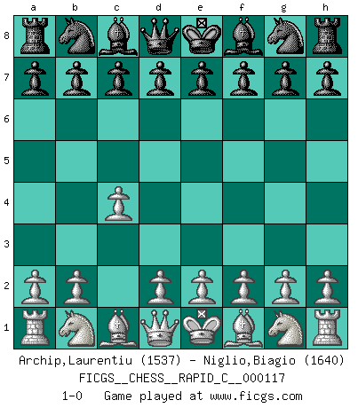 Last move : 1-0 2014 February 1 12:20:27 [Event "FICGS__CHESS__RAPID_C__000117"] [Site "FICGS"] [Date "2014.01.02"] [Round "1"] [White "Archip,Laurentiu"] [Black "Niglio,Biagio"] [Result "1-0"] [WhiteElo "1537"] [BlackElo "1640"] 1.c4 1-0 This chess game has been lost on time (started : 2014.01.02 8:36:12) English Opening Player White won this chess game. Follow this game move after move (download)You can only get good at Chess if you love the game. (Bobby Fischer) Schach ist eine Sache der genauen Beurteilung, wann man zuschlagen und wann man sich ducken muss. (Robert James Fischer) El Ajedrez lo es todo: arte, ciencia y deporte. (Anatoly Karpov) Les échecs sont un jeu terrible. Si vous n'avez pas le centre, votre adversaire a une position plus libre. Par contre, si vous avez le centre, alors vous avez vraiment quelque chose pour laquelle vous inquiéter ! (Siegbert Tarrasch) Animated gif is worth one mega-word. (Unknown)