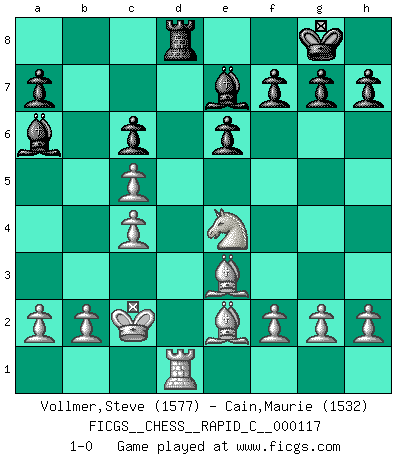 Last move : 1-0 2014 February 19 1:20:51 [Event "FICGS__CHESS__RAPID_C__000117"] [Site "FICGS"] [Date "2014.01.02"] [Round "1"] [White "Vollmer,Steve"] [Black "Cain,Maurie"] [Result "1-0"] [WhiteElo "1577"] [BlackElo "1532"] 1.d4 d5 2.c4 e6 3.Nc3 c5 4.dxc5 d4 5.Ne4 Nc6 6.Nf3 Nge7 7.e3 Nf5 8.exd4 Nfxd4 9.Nxd4 Be7 10.Nxc6 Qxd1+ 11.Kxd1 bxc6 12.Be3 O-O 13.Kc2 Rd8 14.Be2 Ba6 15.Rhd1 Rab8 16.Rxd8+ Rxd8 17.Rd1 1-0 This chess game has been lost on time (started : 2014.01.02 8:36:12) QGD : Tarrasch defense Kingside Castling by player Black (move 12) Player White won this chess game. Follow this game move after move (download)The blunders are all there on the board, waiting to be made. (Savielly Tartakover) Kombinieren und Schwarzhandel gehören verboten. (Savielly Grigorievitsch Tartakower) Una victoria por una combinación errónea, aunque sea espectacular, me llena de horror artístico. (Wilhelm Steinitz) Dieu déplace le joueur, et celui-ci la pièce. Quel Dieu derrière Dieu commence donc la trame ? Arturo Perez-Reverte (prix de littérature policière 1993). Ah, beer! The cause of, and the solution to, all of life's problems. (Homer Simpson)