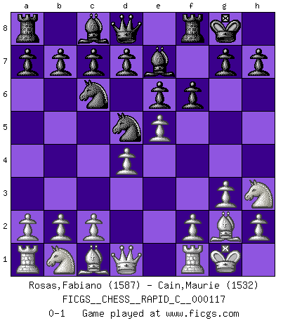 Last move : 0-1 2014 February 28 2:19:35 [Event "FICGS__CHESS__RAPID_C__000117"] [Site "FICGS"] [Date "2014.01.02"] [Round "1"] [White "Rosas,Fabiano"] [Black "Cain,Maurie"] [Result "0-1"] [WhiteElo "1587"] [BlackElo "1532"] 1.e4 e6 2.g3 Nf6 3.Bg2 Be7 4.Nh3 O-O 5.e5 Nd5 6.d4 Nc6 7.O-O f6 0-1 This chess game has been lost on time (started : 2014.01.02 8:36:12) French defense Kingside Castling by player Black (move 4) Kingside Castling by player White (move 7) Player Black won this chess game. Follow this game move after move (download)It is the aim of the modern school, not to treat every position according to one general law, but according to the principle inherent in the position. (Richard Reti) Wer sich die Fähigkeit anerziehen will im Schach selbstständig zu denken, der muß alles meiden, was leblos ist: ausgeklügelte Theorien, die sich auf sehr wenige Beispiele und eine Menge Hirngespinste stützen. (Emanuel Lasker) Cuando no sepas que mover, espera por una idea que se le venga a la la cabeza de tu oponente. Tenlo por seguro de que esa idea estará incorrecta. (Siegbert Tarrasch) Des idées, des idées, j'en ai cent, j'en ai mille. Des bonnes, des mauvaises, applicables, irréalisables... Il suffit de faire le tri ! (Roos) Life is pain my dear and anyone who says otherwise is selling something. (Princess Bride)
