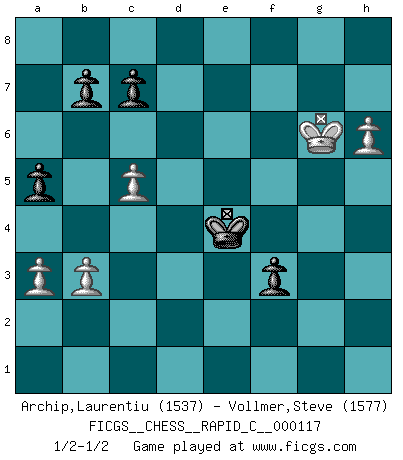 Last move : 1/2-1/2 2014 January 11 20:14:46 [Event "FICGS__CHESS__RAPID_C__000117"] [Site "FICGS"] [Date "2014.01.02"] [Round "1"] [White "Archip,Laurentiu"] [Black "Vollmer,Steve"] [Result "1/2-1/2"] [WhiteElo "1537"] [BlackElo "1577"] 1.c4 e5 2.d4 exd4 3.Qxd4 d6 4.Nf3 Nf6 5.Nc3 Be7 6.g3 O-O 7.Bg2 Nc6 8.Qd1 Be6 9.b3 Qd7 10.O-O Bh3 11.Bb2 Bxg2 12.Kxg2 Rad8 13.Nd5 Rfe8 14.Bxf6 Bxf6 15.Nxf6+ gxf6 16.e3 Qf5 17.Nd4 Nxd4 18.Qxd4 Qe4+ 19.Qxe4 Rxe4 20.Rfd1 Rde8 21.Rd2 a5 22.Rad1 R8e5 23.Rd4 f5 24.Rd5 Rxd5 25.Rxd5 Re5 26.Rxe5 dxe5 27.f4 f6 28.Kh3 Kf7 29.Kh4 Kg6 30.c5 Kh6 31.a3 Kg6 32.Kh3 Kf7 33.g4 Ke6 34.Kh4 exf4 35.exf4 Kd5 36.g5 fxg5+ 37.Kxg5 Ke4 38.h4 h5 39.Kxh5 Kxf4 40.Kg6 Ke4 41.h5 f4 42.h6 f3 1/2-1/2 English Opening Kingside Castling by player Black (move 6) Kingside Castling by player White (move 10) 10 pieces endgame at move 39 : White KPPPP , Black KPPPP WHITE : King + 4 Pawns BLACK : King + 4 Pawns This chess game ended in a draw. Follow this game move after move (download)Kasparov : J'adoube , Ivanchuk : S'il vous plaît ! (Garry Kasparov & Vassily Ivanchuk, Linares 1997) Die Jungen erwarten, dass Opa einfach umfällt. Dann aber kann Opa fünf Stunden lang Schach spielen und die jungen Gegner an die Wand drücken. (Viktor Kortschnoi) En posiciones complicadas, Bobby Fischer pocas veces tuvo que temer de cualquiera. (Paul Keres) D'abord les bases : Jouez et étudiez, puis étudiez et jouez, ensuite jouez et étudiez, puis étudiez et jouez. Deuxièmement : Donnez toujours le meilleur de vous-même ! (Ken Smith) Computers have lots of memory but no imagination. (Anonymous)