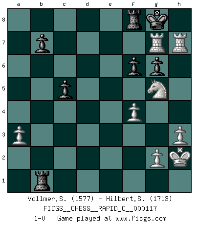 Last move : 1-0 2014 February 10 20:25:58 [Event "FICGS__CHESS__RAPID_C__000117"] [Site "FICGS"] [Date "2014.01.02"] [Round "1"] [White "Vollmer,Steve"] [Black "Hilbert,Stephan J."] [Result "1-0"] [WhiteElo "1577"] [BlackElo "1713"] 1.e4 d5 2.exd5 Qxd5 3.Nf3 Bg4 4.Be2 Nf6 5.d4 c6 6.O-O e6 7.c4 Qd8 8.Nc3 Nbd7 9.h3 Bh5 10.Be3 Qc7 11.Qb3 Qb6 12.Qxb6 axb6 13.a3 Bd6 14.Rfe1 O-O 15.Rad1 Bg6 16.Bd3 Rfd8 17.Bxg6 hxg6 18.Bg5 Rdc8 19.Ne5 Ra5 20.f4 c5 21.d5 exd5 22.Nxd5 b5 23.Nxf6+ Nxf6 24.Rxd6 bxc4 25.Bxf6 gxf6 26.Nxc4 Rb5 27.Rd7 Rb3 28.R1e7 Rf8 29.Nd6 Rxb2 30.Nxf7 Rb1+ 31.Kh2 Kg7 32.Ng5 Kg8 33.Rg7+ Kh8 34.Rh7+ Kg8 35.Rdg7+ 1-0 Scandinavian (centre counter) defense Kingside Castling by player White (move 6) Kingside Castling by player Black (move 14) Player White won this chess game. Follow this game move after move (download)You must take your opponent into a deep dark forest where 2+2=5, and the path leading out is only wide enough for one. (Mikhail Tal) Wer nie einen Fehler gemacht hat, hat nie etwas Neues ausprobiert. (Albert Einstein) El Ajedrez es un mar en el cual un mosquito puede beber y un elefante puede bañarse. (Refrán Hindú) Le pion, dans sa simplicité, marche droit devant lui, mais lorsqu'il prend, il le fait obliquement? Ainsi l'homme, tant qu'il reste pauvre, marche dans la droiture et vit honnêtement, mais lorsqu'il recherche les honneurs, il flatte, se parjure et, par les voies obliques, cherche une position supérieure sur l'échiquier du monde. (Jean de Galles) The problem with manipulation is that people can turn on you. (Horatio Caine, C.S.I. Miami)
