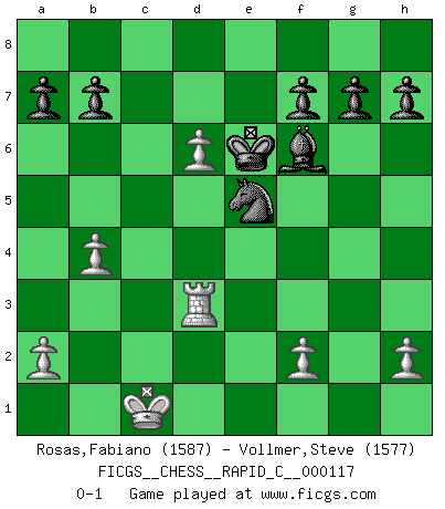Last move : 0-1 2014 February 27 14:19:54 [Event "FICGS__CHESS__RAPID_C__000117"] [Site "FICGS"] [Date "2014.01.02"] [Round "1"] [White "Rosas,Fabiano"] [Black "Vollmer,Steve"] [Result "0-1"] [WhiteElo "1587"] [BlackElo "1577"] 1.e4 e5 2.d4 exd4 3.Qxd4 d6 4.e5 dxe5 5.Qxe5+ Qe7 6.Qxe7+ Bxe7 7.Bb5+ Bd7 8.Nc3 Nc6 9.Bf4 O-O-O 10.Nd5 Nd4 11.Bxc7 Bxb5 12.Bxd8 Bxd8 13.O-O-O Ne6 14.Nf3 Be2 15.Rde1 Bxf3 16.gxf3 Nf6 17.Re5 Nxd5 18.Rxd5 Bf6 19.c4 Rd8 20.Rhd1 Rxd5 21.cxd5 Nd4 22.d6 Kd7 23.b4 Nxf3 24.Rd5 Ke6 25.Rd3 Ne5 0-1 This chess game has been lost on time (started : 2014.01.02 8:36:12) Centre game Queenside Castling by player Black (move 9) Queenside Castling by player White (move 13) Player Black won this chess game. Follow this game move after move (download)Bobby Fischer is the greatest Chess genius of all time ! (Alexander Kotov) Moralische Siege zählen nicht. (Savielly Grigorievitsch Tartakower) Solo el jugador con la iniciativa tiene el derecho a atacar. (Wilhelm Steinitz) Les sacrifices démontrent seulement que quelqu'un a gaffé. (Savielly Tartacover) Lamb in skin of tiger, still fears the wolf. (Chinese proverb)