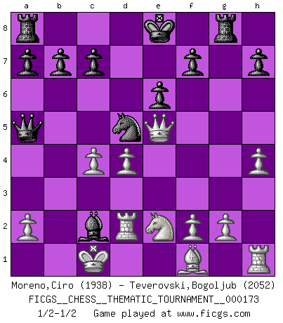 Last move : 1/2-1/2 2014 March 24 15:50:5 [Event "FICGS__CHESS__THEMATIC_TOURNAMENT__000173"] [Site "FICGS"] [Date "2014.01.03"] [Round "1"] [White "Moreno,Ciro"] [Black "Teverovski,Bogoljub"] [Result "1/2-1/2"] [WhiteElo "1938"] [BlackElo "2052"] 1.e4 e6 2.d4 d5 3.Nc3 Nf6 4.Bg5 Bb4 5.exd5 Qxd5 6.Bxf6 Bxc3+ 7.bxc3 gxf6 8.Qg4 Qa5 9.Ne2 Bd7 10.Qg7 Rf8 11.Qxf6 Ba4 12.h4 Rg8 13.Qf4 Nc6 14.O-O-O Ne7 15.Qe5 Nd5 16.c4 Bxc2 17.Rd2 1/2-1/2 French : MacCutcheon variation Queenside Castling by player White (move 14) This chess game ended in a draw. Follow this game move after move (download)Bobby is the finest Chess player this country ever produced. His memory for the moves, his brilliance in dreaming up combinations, and his fierce determination to win are uncanny. (John Collins) Die westlichen Werte sind eine Sprache, welche die Putin-Administration nicht versteht. (Garry Kasparov) Con el fin de mejorar tu juego, debes de estudiar los finales antes que todo, ya que mientras que los finales pueden ser estudiados y dominados por sí mismos, el juegomedio y la apertura deben de ser estudiados en relación con los finales. (José Raúl Capablanca) Les Echecs mettent en conflit, non pas deux intelligences, mais deux volontés. (Lasker) If we knew what we were doing, we would not call it research. (Albert Einstein)