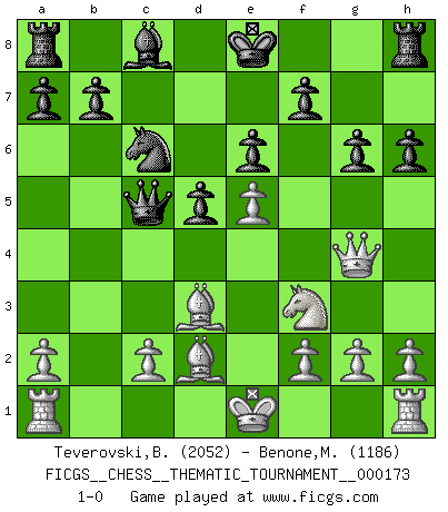 Last move : 1-0 2014 April 22 22:42:51 [Event "FICGS__CHESS__THEMATIC_TOURNAMENT__000173"] [Site "FICGS"] [Date "2014.01.03"] [Round "1"] [White "Teverovski,Bogoljub"] [Black "Benone,Mateia"] [Result "1-0"] [WhiteElo "2052"] [BlackElo "1186"] 1.e4 e6 2.d4 d5 3.Nc3 Nf6 4.Bg5 Bb4 5.e5 h6 6.Bd2 Bxc3 7.bxc3 Ne4 8.Qg4 g6 9.Bc1 Nxc3 10.Bd3 c5 11.dxc5 Qa5 12.Bd2 Qxc5 13.Nf3 Ne4 14.Bxe4 Nc6 15.Bd3 1-0 French : MacCutcheon, Lasker variation Player White won this chess game. Follow this game move after move (download)The most powerful weapon in Chess is to have the next move. (David Bronstein) Ich organisiere ein großes Turnier, was mich etwa 120000 Dollar kostet. Ich denke, das ist das erste Mal in der Schachgeschichte, daß ein Schachgroßmeister auch als Mäzen auftritt. (Miguel Najdorf) EL Ajedrez es como la vida. (Boris Spassky) Même si vous avez un bon coup à faire, regardez toujours s'il n'y en a pas un qui lui soit préférable. (Pedro Damiano) If only people were all showed a certain minimum level of niceness; if only people didn't retract verbal draw offers (without draw box ticked) on ficgs; if only people didn't kill; if only people didn't run concentration / extermination camps, if only people didn't drop nuclear bombs on Hiroshima and Nagasaki, and so on - it would be a much more beautiful world. But sadly, things are not so... (Normajean Yates)