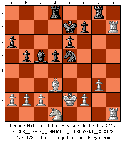 Last move : 1/2-1/2 2014 April 18 14:54:8 [Event "FICGS__CHESS__THEMATIC_TOURNAMENT__000173"] [Site "FICGS"] [Date "2014.01.03"] [Round "1"] [White "Benone,Mateia"] [Black "Kruse,Herbert"] [Result "1/2-1/2"] [WhiteElo "1186"] [BlackElo "2519"] 1.e4 e6 2.d4 d5 3.Nc3 Nf6 4.Bg5 Bb4 5.e5 h6 6.exf6 hxg5 7.fxg7 Rg8 8.h4 gxh4 9.Qg4 Qf6 10.Qxh4 Qxg7 11.Nf3 Nc6 12.O-O-O Bd7 13.g3 a6 14.Bd3 Ne7 15.Qh6 O-O-O 16.Ne5 Bd6 17.Nxd7 Qxh6+ 18.Rxh6 Kxd7 19.Rdh1 c5 20.dxc5 Bxc5 21.Nd1 Nc6 22.Rh7 Ne5 23.Kd2 Ke7 24.Ke2 b5 1/2-1/2 French : MacCutcheon, Chigorin variation Queenside Castling by player White (move 12) Queenside Castling by player Black (move 15) This chess game ended in a draw. Follow this game move after move (download)Adequate compensation for a sacrifice is having a sound combination leading to a winning position; adequate compensation for a blunder is having your opponent snatch defeat from the jaws of victory. (Bruce A. Moon) Im Spitzenschach von heute geht es nur um Vorbereitung, um tiefgründige, sorgfältige Eröffnungsvorbereitung. (Nigel Short) El Ajedrez es parte de una cultura y si una cultura esta en decadencia, entonces también el Ajedrez declinará. (Mikhail Botvinnik) La tactique est l'élément le plus important du milieu de jeu. (Siegbert Tarrasch) All battles are fought by scared men who'd rather be someplace else. (John Wayne in the movie In harm's way)