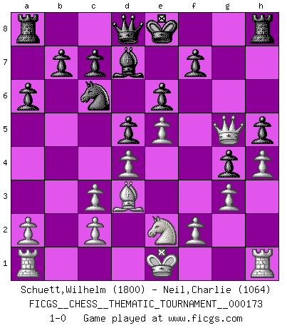 Last move : 1-0 2014 February 21 18:52:4 [Event "FICGS__CHESS__THEMATIC_TOURNAMENT__000173"] [Site "FICGS"] [Date "2014.01.03"] [Round "1"] [White "Schuett,Wilhelm"] [Black "Neil,Charlie"] [Result "1-0"] [WhiteElo "1800"] [BlackElo "1064"] 1.e4 e6 2.d4 d5 3.Nc3 Nf6 4.Bg5 Bb4 5.e5 h6 6.Bd2 Bxc3 7.bxc3 Ne4 8.Qg4 g5 9.Bd3 h5 10.Qe2 Nxd2 11.Qxd2 Bd7 12.h4 g4 13.Ne2 a6 14.g3 Nc6 15.Qg5 1-0 French : MacCutcheon, Lasker variation Player White won this chess game. Follow this game move after move (download)Fischer is completely natural. He plays no roles. He's like a child. Very, very simple. (Zita Rajcsanyi) Wenn ich Weiß habe gewinne ich weil ich Weiß habe, wenn ich Schwarz habe gewinne ich weil ich Bogoljubov bin. (Efim Bogoljubov) Yo no le temo a Spassky. Todos saben que yo soy el mejor. Uno no necesita un torneo para probarlo. (Bobby Fischer) Les échecs, c'est l'art d'analyser. (Mikhail Botvinnik) Every man's memory is his private literature. (Aldous Huxley)