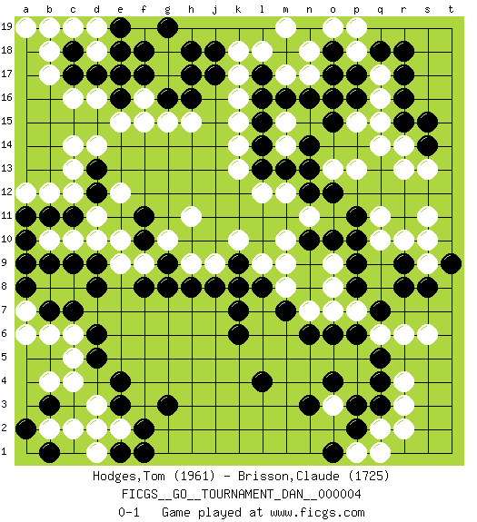Last move : 0-1 2007 May 17 15:53:45 [Event "FICGS__GO__TOURNAMENT_DAN__000004"] [Site "FICGS"] [Date "2007.02.11"] [Round "1"] [Black "Hodges,Tom"] [White "Brisson,Claude"] [Result "0-1"] [Rating 1 "1961"] [Rating 2 "1725"] 1.d5 q16 2.q4 c16 3.e16 c14 4.c17 b17 5.d17 b18 6.j17 o3 7.l4 r3 8.q3 r4 9.q5 q2 10.p2 r2 11.p3 r6 12.o4 d3 13.e3 e2 14.e4 c4 15.f2 c5 16.d6 c6 17.d8 q11 18.o17 q14 19.r8 s6 20.q7 q6 21.p6 c10 22.c7 k8 23.k6 e9 24.j8 j9 25.h8 h9 26.g8 g17 27.g16 f16 28.f17 f15 29.h17 g18 30.f18 g15 31.h16 m17 32.o15 m15 33.n14 m14 34.n12 l12 35.m13 k14 36.l13 k13 37.l14 k15 38.l15 k16 39.l16 k17 40.m16 d2 41.g3 p7 42.p8 o7 43.o6 o8 44.p9 o9 45.p10 r10 46.o10 m8 47.d9 d10 48.f10 f9 49.g9 g10 50.k9 h11 51.f11 e10 52.l8 l9 53.k7 k10 54.k8 m10 55.r17 q17 56.q18 p18 57.r18 n18 58.o18 o19 59.p17 p19 60.l17 n17 61.n16 o16 62.p16 p15 63.o16 l18 64.n19 m19 65.r15 q15 66.s14 s13 67.r16 r13 68.j18 k18 69.b9 d18 70.c18 c19 71.e18 d19 72.b19 a19 73.e19 b19 74.g19 d16 75.e17 e15 76.h18 o13 77.o12 p13 78.n10 m12 79.n13 m9 80.m7 s9 81.r9 q10 82.p11 n11 83.s8 s11 84.b11 b10 85.a10 c12 86.b7 b6 87.c11 d11 88.d12 b12 89.a11 e12 90.d13 d14 91.c9 c13 92.f8 p1 93.o1 q1 94.n3 a12 95.a9 r14 96.s15 n7 97.n6 a7 98.a8 a6 99.b3 b2 100.a2 c2 101.b1 b4 102.e1 d1 103.f1 h15 104.t9 s10 0-1 Here are the names of the openings (joseki) played in the four corners : Corner d16 : c16 e16 Komoku (Somok, Xiao~mu`) 3-4 Point. The komoku (3-4) point is the traditional corner enclosure move.. Ikken Takagakari (Hankan Nop'dakeolch'im, Yi Gaogua`jiao~, 1-Space High Approach). The 5-4 approach move has become more popular in modern times, as modern Go emphasizes speed and influence. Corner q4 : q4 o3 Hoshi (Hwajeom, Seongjeom, Xingwei`) 4-4 Point. The star or hoshi (4-4) point, emphasizing influence at the potential expense of territory. Ikken Kakari (Hankan Keolch'im, Yi Gua`jiao~, 1-Space Low Approach). White 2 is the standard approach move to the 4-4. Corner d4 : d5 d3 Takamoku (Gomok, Gaomu`) 5-4 Point. The takamoku (high) point (5-4). With its emphasis on influence, the 5-4 point complements the 4-4 (hoshi) point in creating an influence-oriented fuseki. Komoku. Black responds with 3-3, 3-5, 4-6, 4-7, 3-6, 3-7. Player White won this Go (weiqi, baduk) game. Follow this game move after move (download)The second line is the line of defeat, the third line is the line of territory, and the fourth line is the line of influence. (Anonymous) I'll be back. (Arnold Schwarzenegger)