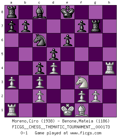 Last move : 0-1 2014 June 26 4:22:49 [Event "FICGS__CHESS__THEMATIC_TOURNAMENT__000173"] [Site "FICGS"] [Date "2014.01.03"] [Round "1"] [White "Moreno,Ciro"] [Black "Benone,Mateia"] [Result "0-1"] [WhiteElo "1938"] [BlackElo "1186"] 1.e4 e6 2.d4 d5 3.Nc3 Nf6 4.Bg5 Bb4 5.e5 h6 6.exf6 hxg5 7.fxg7 Rg8 8.a3 Bxc3+ 9.bxc3 Qf6 10.Qd3 Rxg7 11.Qg3 c5 12.Nf3 c4 13.h4 gxh4 14.Qxh4 Qxh4 15.Rxh4 Nc6 0-1 French : MacCutcheon, Chigorin variation Player Black won this chess game. Follow this game move after move (download)Why must I lose to this idiot ? (Aron Nimzovich) Später, ... hatte ich zunehmend Erfolg in entscheidenden Partien. Vielleicht weil ich eine einfache Wahrheit erkannte: nicht nur ich hatte Angst, auch mein Gegner. (Mikhail Nekhemyevich Tal) El jugador táctico sabe que hacer cuando hay algo que hacer; mientras que el estratega sabe que hacer cuando no hay nada que hacer. (Gerald Abrahams) Je ne crois pas en la psychologie, je crois aux bons coups. (Robert Fischer) The ego is not master in its own house. (Sigmund Freud)