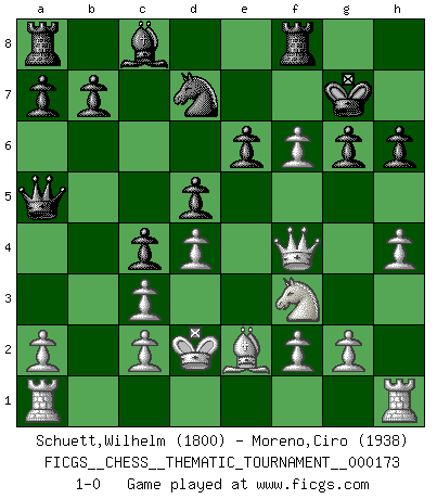 Last move : 1-0 2014 June 5 22:45:43 [Event "FICGS__CHESS__THEMATIC_TOURNAMENT__000173"] [Site "FICGS"] [Date "2014.01.03"] [Round "1"] [White "Schuett,Wilhelm"] [Black "Moreno,Ciro"] [Result "1-0"] [WhiteElo "1800"] [BlackElo "1938"] 1.e4 e6 2.d4 d5 3.Nc3 Nf6 4.Bg5 Bb4 5.e5 h6 6.Bd2 Bxc3 7.bxc3 Ne4 8.Qg4 g6 9.Bd3 Nxd2 10.Kxd2 c5 11.Qf4 Qa5 12.Qf6 O-O 13.Nf3 Nd7 14.Qf4 Kg7 15.h4 c4 16.Be2 f6 17.exf6+ 1-0 This chess game has been lost on time (started : 2014.01.03 0:38:53) French : MacCutcheon, Lasker variation Kingside Castling by player Black (move 12) Player White won this chess game. Follow this game move after move (download)You are for me the Queen on d8 and I am the Pawn on d7 !! (Eduard Gufeld) Der Knackpunkt bei der Konzentration ist, daß wir nur durch sie etwas Neues und Ungewöhnliches am Schachbrett finden können. Sie ist der einzige Weg durch neue neue Ideen eine Überraschung zu bereiten. (Garry Kasparov) Si tu oponente te ofrece un empate, trata de averiguar porque piensa él que esta en una posición peor. (Nigel Short) Un millionnaire : 'Monsieur Steinitz ! Vous ne participez aux tournois que pour l'argent, alors que moi je n'y viens que pour l'honneur.' Steinitz : 'Chacun joue pour ce qu'il n'a pas'... Everything in life is luck. (Donald Trump)