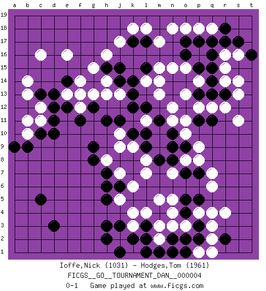Last move : 0-1 2007 June 30 23:18:56 [Event "FICGS__GO__TOURNAMENT_DAN__000004"] [Site "FICGS"] [Date "2007.02.11"] [Round "1"] [Black "Ioffe,Nick"] [White "Hodges,Tom"] [Result "0-1"] [Rating 1 "1031"] [Rating 2 "1961"] 1.q16 r4 2.d3 c16 3.p3 q6 4.m4 q3 5.c5 r14 6.q11 p14 7.o17 s16 8.r17 s11 9.n14 j17 10.c13 e16 11.d10 m17 12.j15 h16 13.h3 k3 14.l3 k4 15.h5 k6 16.h7 m5 17.o4 n3 18.l2 n4 19.n2 o3 20.o2 p4 21.o5 n5 22.p2 m3 23.k2 m2 24.m1 n1 25.o1 j2 26.j3 l4 27.h2 o11 28.o7 p8 29.o12 p12 30.p11 o10 31.p5 q4 32.n8 l8 33.n10 n11 34.l9 k9 35.l10 e13 36.m8 l7 37.k10 j9 38.g9 h8 39.g8 j10 40.k12 m13 41.n13 m14 42.j11 n15 43.p13 q12 44.q13 r12 45.q14 r15 46.p15 c11 47.d11 c12 48.d12 b13 49.d13 b14 50.c10 h14 51.l15 m15 52.k17 k18 53.l17 l18 54.j14 h13 55.h11 f12 56.f11 b10 57.b9 b11 58.a9 j7 59.j6 j5 60.h6 n18 61.r2 q2 62.j1 q1 63.l1 l14 64.k14 p18 65.p17 q18 66.s17 r16 67.q17 o15 68.o14 n12 69.q15 o13 70.r18 o18 71.o12 j13 72.k13 o13 73.r13 s13 74.o12 p1 75.n1 o13 76.t16 s14 77.o12 l11 78.l12 o13 79.o16 p14 80.e14 f14 81.g12 g13 82.e12 f13 83.h15 g15 84.p7 q7 85.o9 p9 86.m11 o8 87.n9 n7 0-1 Here are the names of the openings (joseki) played in the four corners : Corner q4 : r4 p3 Komoku (Somok, Xiao~mu`) 3-4 Point. The komoku (3-4) point is the traditional corner enclosure move.. Ikken Kakari (Hankan Keolch'im, Yi Gua`jiao~, 1-Space Low Pincer). The small knight move is the basic approach move to the 3-4 point stone. It has been continually used for over four centuries. There are limitless variations, with new moves constantly being discovered. Black 2 opens the door to a treaure store of joseki. Corner q16 : q16 r14 Hoshi (Hwajeom, Seongjeom, Xingwei`) 4-4 Point. The star or hoshi (4-4) point, emphasizing influence at the potential expense of territory. Ikken Kakari (Hankan Keolch'im, Yi Gua`jiao~, 1-Space Low Approach). White 2 is the standard approach move to the 4-4. Player White won this Go (weiqi, baduk) game. Follow this game move after move (download)Pon-nuki is worth thirty points. (Anonymous) We cannot be sure of having something to live for unless we are willing to die for it. (Ernesto Che Guevara)