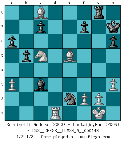 Last move : 1/2-1/2 2014 March 6 2:6:2 [Event "FICGS__CHESS__CLASS_A__000148"] [Site "FICGS"] [Date "2014.01.03"] [Round "1"] [White "Sorcinelli,Andrea"] [Black "Oortwijn,Ron"] [Result "1/2-1/2"] [WhiteElo "2000"] [BlackElo "2009"] 1.e4 e5 2.Nf3 Nc6 3.Bb5 a6 4.Ba4 Nf6 5.O-O Be7 6.Re1 b5 7.Bb3 O-O 8.c3 d6 9.h3 Bb7 10.d4 Re8 11.Nbd2 Bf8 12.a3 h6 13.Bc2 d5 14.exd5 Qxd5 15.Ne4 exd4 16.Nxf6+ gxf6 17.Qd3 Rxe1+ 18.Nxe1 f5 19.Qg3+ Kh8 20.Bf4 dxc3 21.bxc3 Bg7 22.Rd1 Qc4 23.Bxf5 Qxc3 24.Qxc3 Bxc3 25.Nd3 Nd4 26.Bg4 Rg8 27.Nc5 Bc8 28.Be5+ Kh7 29.Bxc8 Ne2+ 1/2-1/2 Ruy Lopez : Closed, 7...O-O Kingside Castling by player White (move 5) Kingside Castling by player Black (move 7) This chess game ended in a draw. Follow this game move after move (download)Some sacrifices are sound; the rest are mine. (Mikhail Tal) Strategie ist, wie man ein Mädchen auf den Rücksitz bekommt. Taktik ist, was man tut, wenn man dann dort ist. (Anonymous) La señal de un Gran Maestro es su habilidad de ganar una partida rápidamente y sin dolor. (Irving Chernev) Il a essayé de se convaincre qu'il pourrait empêcher toutes les erreurs et ne jamais perdre. L'horreur ! Gary Kasparov au sujet de Robert Fischer. When you have everything, sometimes it feels like nothing. (Horatio Caine, C.S.I. Miami)