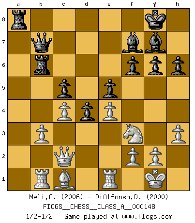 Last move : 1/2-1/2 2014 March 12 14:38:6 [Event "FICGS__CHESS__CLASS_A__000148"] [Site "FICGS"] [Date "2014.01.03"] [Round "1"] [White "Meli,Cosimo Leonardo"] [Black "DiAlfonso,Darren"] [Result "1/2-1/2"] [WhiteElo "2006"] [BlackElo "2000"] 1.e4 c5 2.Nf3 d6 3.c3 Nf6 4.Be2 g6 5.Qc2 Qc7 6.d4 cxd4 7.Nxd4 Bg7 8.Be3 Nc6 9.O-O O-O 10.Nb5 Qd8 11.h3 a6 12.Nd4 Qc7 13.Nxc6 bxc6 14.Nd2 Rb8 15.Bf4 e5 16.Be3 d5 17.Rfe1 a5 18.Rad1 Be6 19.b3 Nd7 20.Nf3 h6 21.Bc1 Nc5 22.Ba3 Qb6 23.Bd3 Nxd3 24.Qxd3 Rfd8 25.Qe2 f6 26.Be7 Re8 27.Ba3 Bf7 28.c4 d4 29.Nh4 c5 30.Rb1 a4 31.Red1 Qa7 32.Bc1 axb3 33.axb3 Rb6 34.Nf3 Qb7 35.Qc2 Ra8 36.Re1 1/2-1/2 Sicilian Kingside Castling by player White (move 9) Kingside Castling by player Black (move 9) This chess game ended in a draw. Follow this game move after move (download)Chess is above all, a fight ! (Emanuel Lasker) Es war undenkbar für die Behörden, dass ein sowjetischer Großmeister auf diese Art und Weise [Fischer-Taimanov 6:0] verliert, ohne dass es eine politischer Erklärung dafür gäbe. (Mark Taimanov) A la fecha, Fischer esta simplemente un nivel arriba de todos los mejores jugadores de Ajedrez del mundo. (John Jacobs) Celui qui prend des risques peut perdre, celui qui n'en prend pas perd toujours. (Xavier Tartacover) Have no fear of perfection - you'll never reach it. (Salvador Dali)