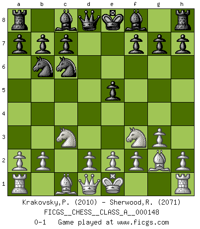 Last move : 0-1 2014 March 8 15:5:53 [Event "FICGS__CHESS__CLASS_A__000148"] [Site "FICGS"] [Date "2014.01.03"] [Round "1"] [White "Krakovsky,Peter"] [Black "Sherwood,Russell"] [Result "0-1"] [WhiteElo "2010"] [BlackElo "2071"] 1.c4 e5 2.Nc3 Nf6 3.Nf3 Nc6 4.g3 d5 5.cxd5 Nxd5 6.Bg2 Nb6 0-1 This chess game has been lost on time (started : 2014.01.03 11:42:41) English Opening Player Black won this chess game. Follow this game move after move (download)Chess books should be used as we use glasses: to assist the sight, although some players make use of them as if they thought they conferred sight. (Jose Raul Capablanca) Schach ist Leben. (Robert James Fischer) Diferente gente reacciona diferentemente en aceptar la derrota. (Bobby Fischer) 'L'échange des dames est un coup dur pour les deux adversaires...' Un journaliste lors d'une partie du match Spassky-Fischer I fear not the man who has practiced 10,000 kicks once, but I fear the man who has practiced one kick 10,000 times. (Bruce Lee)