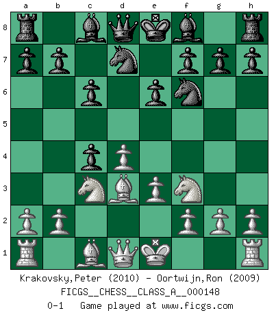 Last move : 0-1 2014 February 18 13:20:12 [Event "FICGS__CHESS__CLASS_A__000148"] [Site "FICGS"] [Date "2014.01.03"] [Round "1"] [White "Krakovsky,Peter"] [Black "Oortwijn,Ron"] [Result "0-1"] [WhiteElo "2010"] [BlackElo "2009"] 1.c4 e6 2.d4 d5 3.Nc3 Nf6 4.Nf3 c6 5.e3 Nbd7 6.Bd3 dxc4 0-1 This chess game has been lost on time (started : 2014.01.03 11:42:41) English Opening Player Black won this chess game. Follow this game move after move (download)All I want to do, ever, is just play Chess. (Bobby Fischer) Kritik überlasse ich den Spießern. Ich zeige nichts, wofür ich mich schämen muss. (Alexandra Kosteniuk) Alguna parte de un error es siempre correcto. (Savielly Tartakover) À la honte des hommes, on sait que les lois du jeu sont les seules qui soient partout justes, claires, inviolables et exécutées. Pourquoi l'Indien qui a donné les règles du jeu d'échecs est-il obéi de bon gré dans toute la terre, et que les décrétales des papes, par exemple, sont aujourd'hui un objet d'horreur et de mépris ? C'est que l'inventeur des échecs combina tout avec justesse pour la satisfaction des joueurs, et que les papes, dans leurs décrétales, n'eurent en vue que leur seul avantage. L'Indien voulut exercer également l'esprit des hommes et leur donner du plaisir; les papes ont voulu abrutir l'esprit des hommes. Voltaire (Dictionnaire philosophique / Garnier 1967) Panic is a sudden desertion of us, an a going over to the enemy of our imagination. (Christian Nevell Bovee)