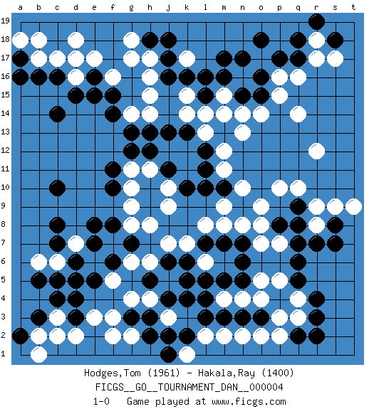 Last move : 1-0 2007 April 17 4:38:0 [Event "FICGS__GO__TOURNAMENT_DAN__000004"] [Site "FICGS"] [Date "2007.02.11"] [Round "1"] [Black "Hodges,Tom"] [White "Hakala,Ray"] [Result "1-0"] [Rating 1 "1961"] [Rating 2 "1400"] 1.d4 q16 2.r4 o4 3.m3 q4 4.r3 q3 5.q5 p5 6.q6 o7 7.j4 d16 8.c14 g17 9.c16 c17 10.d17 e17 11.d15 d18 12.b16 r9 13.q8 r8 14.r7 r12 15.q17 r17 16.p17 r18 17.m17 k17 18.o15 q14 19.c10 c6 20.c5 g4 21.h3 f2 22.g3 f3 23.d6 c3 24.d3 d2 25.c7 b6 26.b5 d7 27.c8 e6 28.d5 f5 29.f15 p10 30.q2 p2 31.r2 o2 32.n5 o5 33.n6 p7 34.q7 o9 35.e7 f7 36.e8 h6 37.j6 j7 38.k6 k7 39.l7 l6 40.l5 l8 41.m7 m8 42.n7 n8 43.l15 n13 44.l12 h15 45.g13 l13 46.k13 l14 47.k16 k14 48.j13 m12 49.j17 k15 50.l16 h16 51.j16 h14 52.h13 g10 53.f11 k1 54.h9 g9 55.h10 h8 56.l11 m11 57.k2 l2 58.j1 k3 59.j2 m4 60.l4 m2 61.l3 n4 62.n3 n2 63.m5 g11 64.g12 h11 65.q18 p16 66.o16 o14 67.j11 j10 68.k10 j9 69.m10 n10 70.h18 b17 71.a17 a18 72.a16 b18 73.q9 q10 74.b3 b2 75.c4 c2 76.r19 o17 77.o18 p15 78.f10 g18 79.s18 s17 80.f8 g8 81.e5 e3 82.a2 b1 83.f6 g6 84.g7 j5 85.k5 h4 86.h5 g2 87.o3 p3 88.e16 d17 89.n15 j3 90.k4 m14 91.s8 s9 92.s7 t9 93.p8 o8 94.h12 m9 95.l10 m15 96.m16 n14 97.n17 f16 98.e15 h17 99.j18 g14 100.f14 j3 101.h2 1-0 Here are the names of the openings (joseki) played in the four corners : Corner q4 : r4 o4 Komoku (Somok, Xiao~mu`) 3-4 Point. The komoku (3-4) point is the traditional corner enclosure move.. Nikken Takagakari (Dukan Nop'dakeolch'im, E`r Gaojia, 2-Space High Approch). The great master Honinbo Shuei (1852-1906) favored the two-space high (niken taka-gakari) approach, especially in two stone handicap games. This approach move was very popular in the 1910s. Wu Qingyuan = Go Seigen frequently played this way, considering it a good "whole board" approach. In recent years, O Rissei has often used the two-space high approach. Corner d16 : d16 c14 Hoshi (Hwajeom, Seongjeom, Xingwei`) 4-4 Point. The star or hoshi (4-4) point, emphasizing influence at the potential expense of territory. Ikken Kakari (Hankan Keolch'im, Yi Gua`jiao~, 1-Space Low Approach). Black 2 is the standard approach move to the 4-4. Player Black won this Go (weiqi, baduk) game. Follow this game move after move (download)Every move brings change. (Pierre Audouard) Empty your mind, be formless, shapeless — like water. (Bruce Lee)