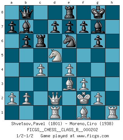 Last move : 1/2-1/2 2014 May 4 21:59:45 [Event "FICGS__CHESS__CLASS_B__000202"] [Site "FICGS"] [Date "2014.01.04"] [Round "1"] [White "Shvetsov,Pavel"] [Black "Moreno,Ciro"] [Result "1/2-1/2"] [WhiteElo "1801"] [BlackElo "1938"] 1.e4 c5 2.Nf3 g6 3.d4 cxd4 4.Nxd4 Bg7 5.c4 Nc6 6.Be3 Nf6 7.Nc3 Ng4 8.Qxg4 Nxd4 9.Qd1 Ne6 10.Rc1 O-O 11.h4 b6 12.h5 Bb7 13.Qd2 Rc8 14.Nd5 Re8 15.hxg6 hxg6 16.f3 Rc6 17.Rd1 Qb8 18.Kf2 1/2-1/2 Sicilian : Hungarian variation Kingside Castling by player Black (move 10) This chess game ended in a draw. Follow this game move after move (download)Chess is mental torture. (Garry Kasparov) Wer mein Gambit spielt, muß bereit sein, alle Brücken hinter sich abzubrechen. Es verändert den ganzen Menschen. Es wirkt wie ein Zauberstab und fördert verkümmerte, gute Charakter- eigenschaften wieder zu Tage. (Emil Joseph Diemer) Cualquier cambio de material en una posición debe venir por medio de un mate, una captura o promoción de Peón. (Purdy) Demandez au pauvre Cg1 ce qu'il en pense. Eduard Gufeld à propos de la variante Saemisch de l'Est-Indienne. Life is like a ten-speed bicycle: most of us have gears we never use. (Charles M. Schulz)
