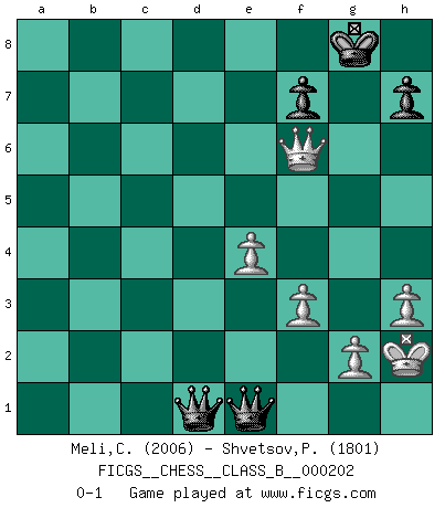 Last move : 0-1 2014 April 3 12:8:57 [Event "FICGS__CHESS__CLASS_B__000202"] [Site "FICGS"] [Date "2014.01.04"] [Round "1"] [White "Meli,Cosimo Leonardo"] [Black "Shvetsov,Pavel"] [Result "0-1"] [WhiteElo "2006"] [BlackElo "1801"] 1.e4 c5 2.Nf3 d6 3.d4 cxd4 4.Nxd4 Nf6 5.f3 e5 6.Nb3 Be6 7.c4 Nbd7 8.Be3 Rc8 9.N3d2 b5 10.c5 b4 11.a3 bxa3 12.Nxa3 d5 13.b4 d4 14.Bg5 a5 15.Ba6 axb4 16.Bxc8 Qxc8 17.Nb5 Bxc5 18.Ra8 Nb8 19.Na7 Qb7 20.Qa4+ Bd7 21.Qa5 O-O 22.Rxb8 Rxb8 23.Qxc5 Ra8 24.O-O Qxa7 25.Qxe5 d3 26.Kh1 Qb6 27.Nc4 Qc6 28.Qd4 b3 29.Bxf6 gxf6 30.Nb6 b2 31.Nxa8 Qc2 32.h3 b1Q 33.Rxb1 Qxb1+ 34.Kh2 Qb8+ 35.Kg1 Qxa8 36.Qxd7 Qa1+ 37.Kh2 Qe5+ 38.Kg1 Qc3 39.Qd6 Qe1+ 40.Kh2 d2 41.Qxf6 d1Q 0-1 Sicilian : Prins (Moscow) variation Kingside Castling by player Black (move 21) Kingside Castling by player White (move 24) Promotion Queen by player Black (move 32) Promotion Queen by player Black (move 41) Player Black won this chess game. Follow this game move after move (download)Botvinnik tried to take the mystery out of Chess, always relating it to situations in ordinary life. He used to call Chess a typical inexact problem similar to those which people are always having to solve in everyday life. (Garry Kasparov) Wenn Du absolut nicht mehr weißt, was Du tun sollst, dann ist es Zeit für Panik. (John van der Wiel) Debemos de asegurarnos de que el Ajedrez no se convierta en un lenguaje muerto, muy interesante, pero tan solo para un grupo muy pequeño. (Sytze Faber) La vie et les Echecs sont tous les deux une lutte constante. (Lasker) The Internet isn't free. It just has an economy that makes no sense to capitalism. (Brad Shapcott)