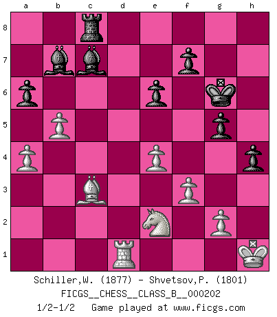 Last move : 1/2-1/2 2014 March 8 15:19:7 [Event "FICGS__CHESS__CLASS_B__000202"] [Site "FICGS"] [Date "2014.01.04"] [Round "1"] [White "Schiller,Wilfried"] [Black "Shvetsov,Pavel"] [Result "1/2-1/2"] [WhiteElo "1877"] [BlackElo "1801"] 1.d4 d5 2.c4 c6 3.Nc3 Nf6 4.Nf3 e6 5.Bg5 h6 6.Bh4 dxc4 7.e4 g5 8.Bg3 b5 9.Be2 Bb7 10.O-O Nbd7 11.Ne5 Bg7 12.Nxd7 Nxd7 13.Bd6 a6 14.a4 b4 15.Bxb4 Qb6 16.Ba3 Qxd4 17.Qc2 Qe5 18.Bxc4 Qc7 19.Ne2 c5 20.f3 O-O 21.Rac1 Rfd8 22.Kh1 Rac8 23.b3 Ne5 24.Ng1 Nxc4 25.Qxc4 Be5 26.Qxc5 Qb8 27.Qe3 Rxc1 28.Qxc1 Bxh2 29.Bb2 Rc8 30.Qa1 Qf4 31.Qd1 Qd6 32.Ne2 Qxd1 33.Rxd1 Bc7 34.Bf6 Kh7 35.b4 Kg6 36.Bc3 h5 37.b5 h4 1/2-1/2 QGD Slav defense Kingside Castling by player White (move 10) Kingside Castling by player Black (move 20) This chess game ended in a draw. Follow this game move after move (download)Bobby Fischer is the greatest Chess player who has ever lived. (Ken Smith) Unter Putin wird alles Geld aus Russland wie von einem Staubsauger nach Moskau umgeleitet, das ist wie ein schwarzes Loch. (Garry Kasparov) Alguna parte de un error es siempre correcto. (Savielly Tartakover) Les Echecs ont trois composantes : le temps, l'espace et le matériel en dernier. (Mikhail Tal) There are two kinds of people in the world, my friend. Those who have a loaded gun and those who dig. You dig ! (Blondie in The Good, The Bad and The Ugly)