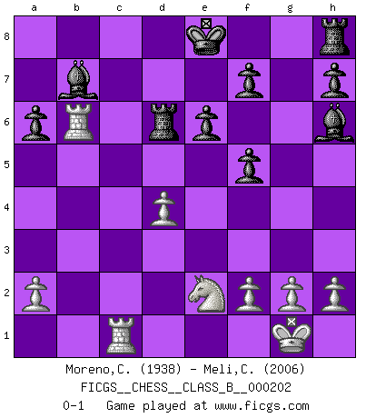 Last move : 0-1 2014 June 8 5:40:25 [Event "FICGS__CHESS__CLASS_B__000202"] [Site "FICGS"] [Date "2014.01.04"] [Round "1"] [White "Moreno,Ciro"] [Black "Meli,Cosimo Leonardo"] [Result "0-1"] [WhiteElo "1938"] [BlackElo "2006"] 1.d4 c6 2.c4 d5 3.cxd5 cxd5 4.Bf4 Nf6 5.Nc3 Qb6 6.Rc1 Nc6 7.e3 Qxb2 8.Bd3 Nb4 9.Nge2 a6 10.O-O Nxd3 11.Qxd3 Qa3 12.Be5 e6 13.Qc2 Bd7 14.e4 dxe4 15.Bxf6 gxf6 16.Qxe4 f5 17.Qxb7 Rd8 18.Rb1 Qd6 19.Rfc1 Bh6 20.Rb6 Bc8 21.Nb5 Bxb7 22.Nxd6+ Rxd6 0-1 Queen's pawn Kingside Castling by player White (move 10) Player Black won this chess game. Follow this game move after move (download)Chess, like love, is infectious at any age. (Flohr) Ja, jede Frau in Holland liebt mich bestimmt, und alle Männer hassen mich. (Loek van Wely) Debió haber existido una vez en que los hombres eran semidióses, de otra manera no hubiesen podido inventar el Ajedrez. (Gustav Schenk) Vouloir jouer aux échecs contre soi-même est aussi paradoxal que vouloir marcher sur son ombre. (Stefan Zweig) Programming can only do so much before it becomes too much. (Don Groves)