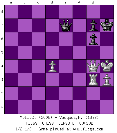 Last move : 1/2-1/2 2014 June 21 15:15:27 [Event "FICGS__CHESS__CLASS_B__000202"] [Site "FICGS"] [Date "2014.01.04"] [Round "1"] [White "Meli,Cosimo Leonardo"] [Black "Vasquez,Fernando"] [Result "1/2-1/2"] [WhiteElo "2006"] [BlackElo "1872"] 1.e4 e5 2.Nf3 Nf6 3.d4 Nxe4 4.Bd3 d5 5.Nxe5 Bd6 6.c4 O-O 7.cxd5 Bb4+ 8.Nd2 Qxd5 9.O-O Bxd2 10.Bxd2 Nxd2 11.Qxd2 Nc6 12.Nxc6 Qxc6 13.Qf4 Qb6 14.Rac1 c6 15.Rc5 Be6 16.Rh5 f5 17.Re1 Bf7 18.Rxf5 Qb4 19.Rfe5 Bxa2 20.Qg4 Qd2 21.Qg3 Bf7 22.h3 Qxb2 23.R5e4 Qd2 24.R1e3 Rae8 25.Rg4 Bg6 26.Bxg6 hxg6 27.Rxe8 Qd1+ 28.Kh2 Rxe8 29.Qa3 Qc2 30.Qxa7 Qxf2 31.Qxb7 Re1 32.Qxc6 Qg1+ 33.Kg3 Re3+ 34.Kh4 Qe1+ 35.Kg5 Rxh3 36.Qc8+ Kh7 37.gxh3 Qe5+ 38.Kh4 Qe1+ 39.Rg3 Qe4+ 40.Qg4 Qe7+ 41.Qg5 Qe4+ 42.Qg4 Qe7+ 43.Qg5 Qe4+ 44.Qg4 Qe7+ 1/2-1/2 Petrov : Modern attack, Symmetrical variation Kingside Castling by player Black (move 6) Kingside Castling by player White (move 9) 10 pieces endgame at move 35 : White KQRPP , Black KQRPP WHITE : King + 1 Queen 1 Rook 2 Pawns BLACK : King + 1 Queen 1 Rook 2 Pawns 9 pieces endgame at move 37 : White KQRPP , Black KQPP WHITE : King + 1 Queen 1 Rook 2 Pawns BLACK : King + 1 Queen 2 Pawns This chess game ended in a draw. Follow this game move after move (download)As one by one I mowed them down, my superiority soon became apparent. (Jose Capablanca) Ein Buch ist ein Spiegel; wenn ein Affe hineinsieht, so kann kein Apostel heraus gucken. (Georg Christoph Lichtenberg) Después de la respuesta de las negras a 1.e4 con 1..e5, se quedan siempre tratando de entrar dentro del juego. (Howard Staunton) Vous savez, camarade Pachman, je n'éprouve pas de plaisir à être ministre, je jouerais plutôt aux échecs comme vous, ou alors ferais une révolution au Venezuela. (Che Guevara à Ludek Pachman, 'Checkmate in Prague', 1975) The difference between perseverance and obstinacy is that one comes from a strong will, and the other from a strong won't. (Henry Ward Beecher)