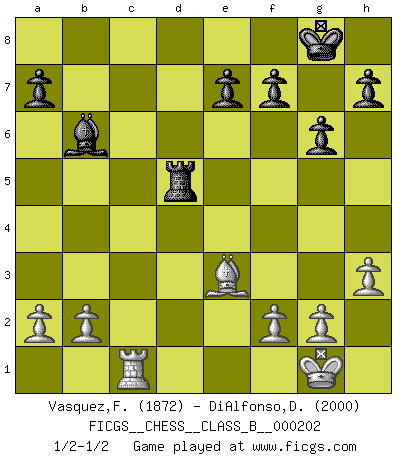 Last move : 1/2-1/2 2014 April 12 9:36:13 [Event "FICGS__CHESS__CLASS_B__000202"] [Site "FICGS"] [Date "2014.01.04"] [Round "1"] [White "Vasquez,Fernando"] [Black "DiAlfonso,Darren"] [Result "1/2-1/2"] [WhiteElo "1872"] [BlackElo "2000"] 1.e4 c5 2.c3 Nf6 3.e5 Nd5 4.d4 cxd4 5.cxd4 d6 6.Nf3 Nc6 7.Bc4 Nb6 8.Bb5 dxe5 9.Nxe5 Bd7 10.Nxd7 Qxd7 11.O-O g6 12.Be3 Bg7 13.Nc3 Rd8 14.Qb3 O-O 15.Rfd1 Qc7 16.Bxc6 bxc6 17.Rac1 Rd7 18.Qb4 Rfd8 19.h3 Nd5 20.Nxd5 Rxd5 21.Qa4 Qb6 22.Qxc6 Bxd4 23.Qxb6 Bxb6 24.Rxd5 Rxd5 1/2-1/2 Sicilian : Alapin's variation (2.c3) Kingside Castling by player White (move 11) Kingside Castling by player Black (move 14) This chess game ended in a draw. Follow this game move after move (download)It's always better to sacrifice your opponent's men. (Savielly Tartakover) Schach ist das schnellste Spiel der Welt, weil man in jeder Sekunde Tausende von Gedanken ordnen muß. (Albert Einstein) a manera como él juega al Ajedrez, demuestra la completa naturaleza de un hombre. (Stanley Ellin) Si le désir cupide (et stupide) de gagner est une inépuisable source de souffrance, une combinaison brillante sur l'échiquier est une découverte : le coquelicot qui s'épanouit lorsque apparaît la Voie Lactée. (Arrabal) The project of the man are lower than those of the sky. (Chinese proverb)