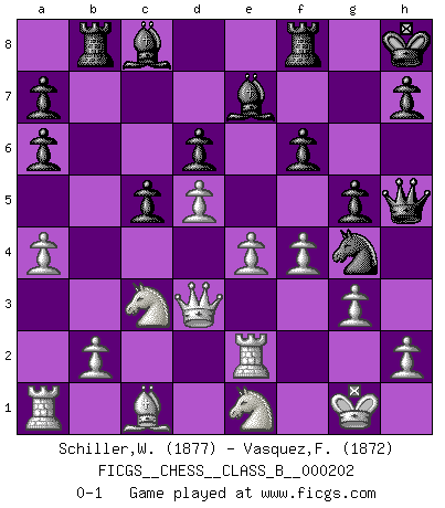 Last move : 0-1 2014 May 18 19:51:37 [Event "FICGS__CHESS__CLASS_B__000202"] [Site "FICGS"] [Date "2014.01.04"] [Round "1"] [White "Schiller,Wilfried"] [Black "Vasquez,Fernando"] [Result "0-1"] [WhiteElo "1877"] [BlackElo "1872"] 1.d4 Nf6 2.c4 e6 3.g3 c5 4.d5 exd5 5.cxd5 d6 6.Nc3 Be7 7.e4 O-O 8.Qc2 Nbd7 9.a4 Nb8 10.Nf3 Na6 11.Bxa6 bxa6 12.O-O Rb8 13.Re1 Ng4 14.Bf4 f6 15.Re2 Qe8 16.Ne1 g5 17.Bc1 Qh5 18.f3 Ne5 19.f4 Ng4 20.Qd3 Kh8 0-1 Catalan Opening Kingside Castling by player Black (move 7) Kingside Castling by player White (move 12) Player Black won this chess game. Follow this game move after move (download)Chess is so inspiring that I do not believe a good player is capable of having an evil thought during the game. (Wilhelm Steinitz) Es ist besser die Steine des Gegners zu opfern. (Savielly Grigorievitsch Tartakower) El Ajedrez moderno está demasiado preocupado con cosas como la estructura de Peones. Olvidenlo, el Jaque Mate termina la partida. (Nigel Short) Karpov est une pièce de musée. (Garry Kasparov) Are you threatening me, Master Jedi ? (Chancellor Palpatine in Star Wars ep.3)