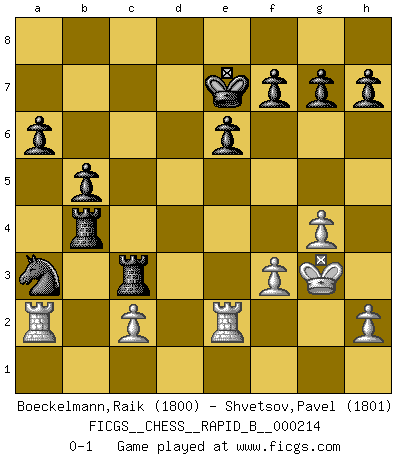 Last move : 0-1 2014 February 20 23:51:42 [Event "FICGS__CHESS__RAPID_B__000214"] [Site "FICGS"] [Date "2014.01.05"] [Round "1"] [White "Boeckelmann,Raik"] [Black "Shvetsov,Pavel"] [Result "0-1"] [WhiteElo "1800"] [BlackElo "1801"] 1.e4 c5 2.Nf3 d6 3.d4 cxd4 4.Nxd4 Nf6 5.Nc3 a6 6.Bd3 e6 7.O-O b5 8.a3 Bb7 9.Be3 Nbd7 10.b4 Qc7 11.Nde2 Ng4 12.Qd2 Nxe3 13.Qxe3 Be7 14.Na2 Qb6 15.Qxb6 Nxb6 16.Nac3 Bf6 17.Ra2 Rc8 18.f3 Bxc3 19.Nxc3 Rxc3 20.Re1 Ke7 21.Kf2 d5 22.exd5 Bxd5 23.R2a1 Bc4 24.Bxc4 Nxc4 25.Ra2 Nxa3 26.Re2 Rhc8 27.g4 R8c4 28.Kg3 Rxb4 0-1 Sicilian : Najdorf Kingside Castling by player White (move 7) Player Black won this chess game. Follow this game move after move (download)The Pin is mightier than the sword. (Fred Reinfeld) Ich tröste mich mit dem Vergnügen, daß Schachfans, Zuschauer und Leser glücklich sind, wenn ein Großmeister etwas riskiert, statt nur Klötzchen zu schieben. (Mikhail Nekhemyevich Tal) La caracteristica mas importante en la posición del Ajedrez es la actividad de las piezas. Esto es absolutamente fundamental en todas las fases del juego: Apertura, Juego Medio y especialmente Finales. La limitación primordial en la actividad de una pieza, es la estructuración de los Peones. (Michael Stean) Assurément je connaissais par expérience le mystérieux attrait de ce jeu royal, le seul entre tous les jeux inventés par les hommes qui échappe souverainement à la tyrannie du hasard, le seul où l'on ne doive sa victoire qu'à son intelligence ou plutôt à une certaine forme d'intelligence. Mais n'est-ce pas déjà le limiter injurieusement que d'appeler les échecs un jeu ? N'est-ce pas une science, un art ou quelque chose qui, comme le cercueil de Mahomet entre ciel et terre, est suspendu entre l'un et l'autre, et qui réunit un nombre incroyable de contraires ? [...] C'est une pensée qui ne mène à rien, une mathématique qui n'établit rien, un art qui ne laisse pas d'uvre, une architecture sans matière; et il l'a prouvé néanmoins qu'il était plus durable, à sa manière, que les livres ou que tout autre monument, ce jeu unique qui appartient à tous les peuples et à tous les temps, et dont personne ne sait quel dieu en fit don à la terre pour tuer l'ennui, pour aiguiser l'esprit et stimuler l'âme. Où commence-t-il, où finit-il ? (Stefan Zweig) God, you are such an idiot. - Actually, I thought I was more of a jerk. (Gregory House to Stacy Warner, House M.D.)